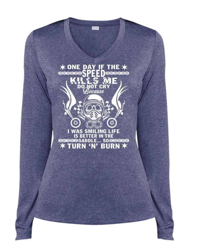 The Speed Kills Me Do Not Cry T Shirt, Being A Biker T Shirt, Cool Shirt (Ladies LS Heather V-Neck)