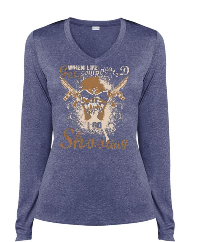When Life Gets Complicated Go Shooting T Shirt, I Love Shooting T Shirt, Cool Shirt (Ladies LS Heather V-Neck)