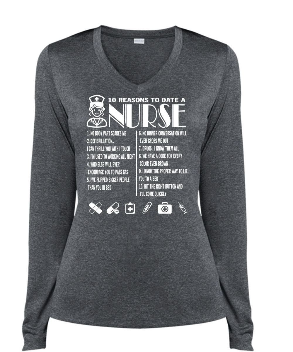 10 Reasons To Date A Nurse T Shirt, Being A Nurse T Shirt, Cool Shirt (Ladies LS Heather V-Neck)