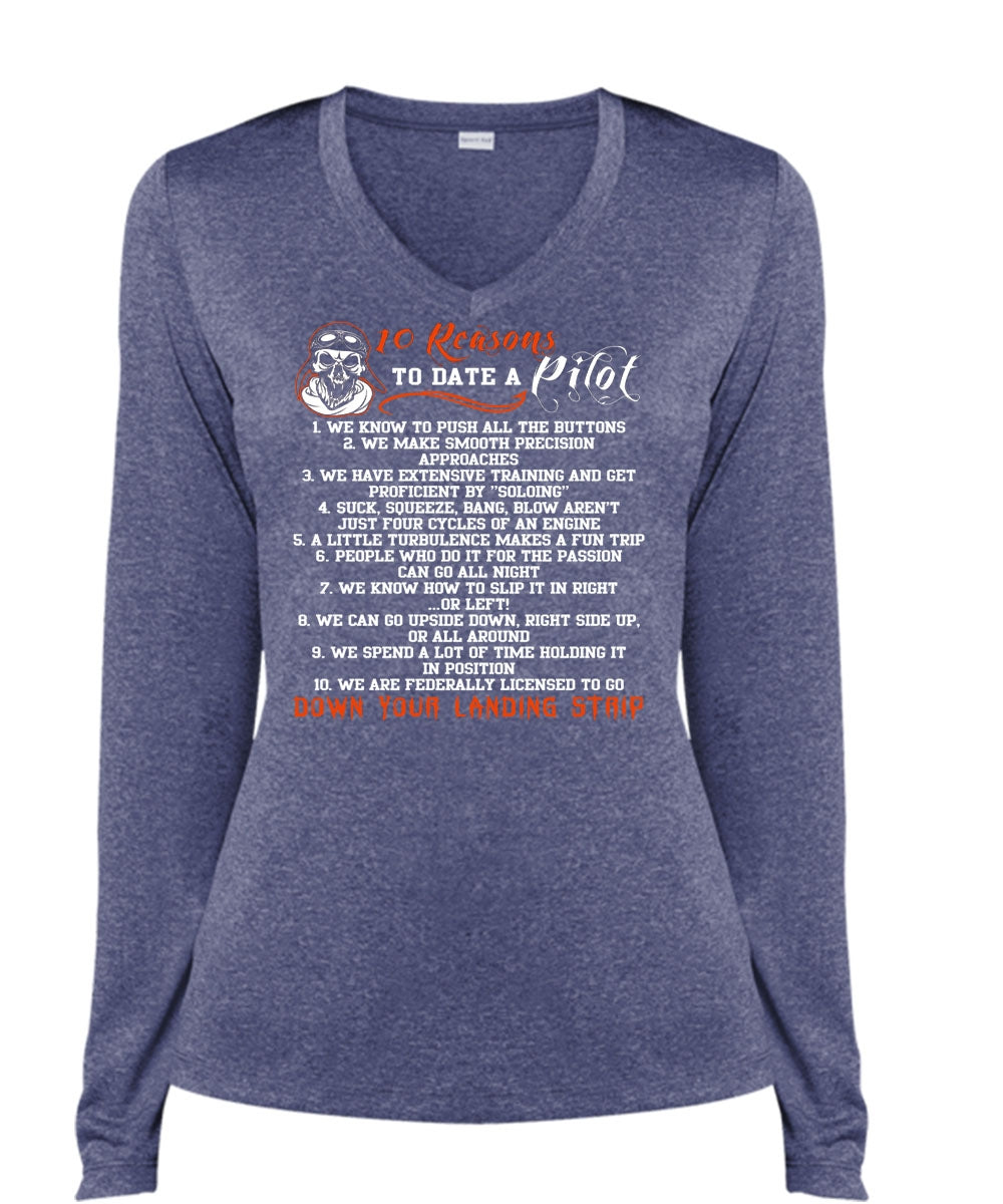 10 Reasons To Date A Pilot T Shirt, Being A Pilot T Shirt, Cool Shirt (Ladies LS Heather V-Neck)