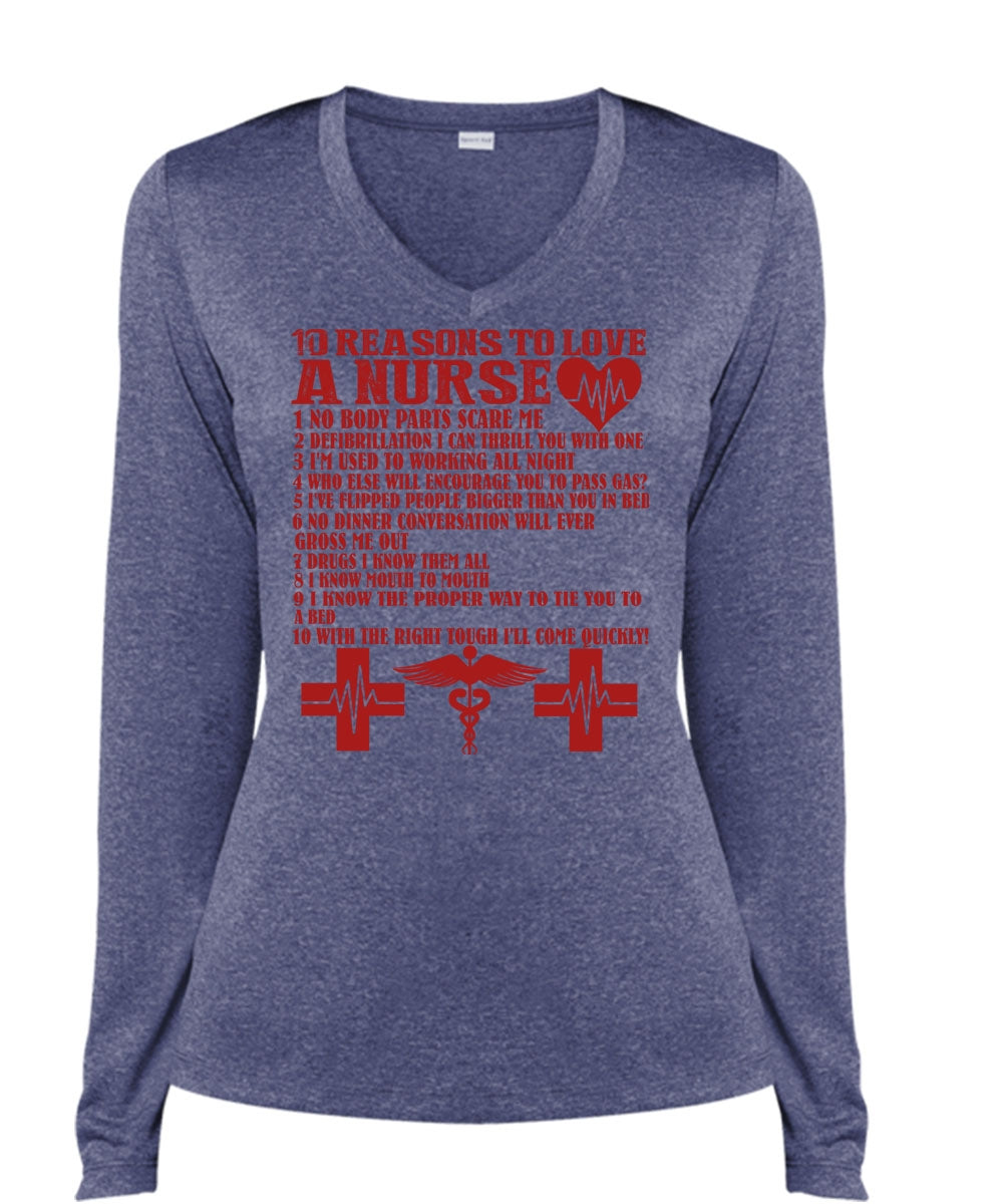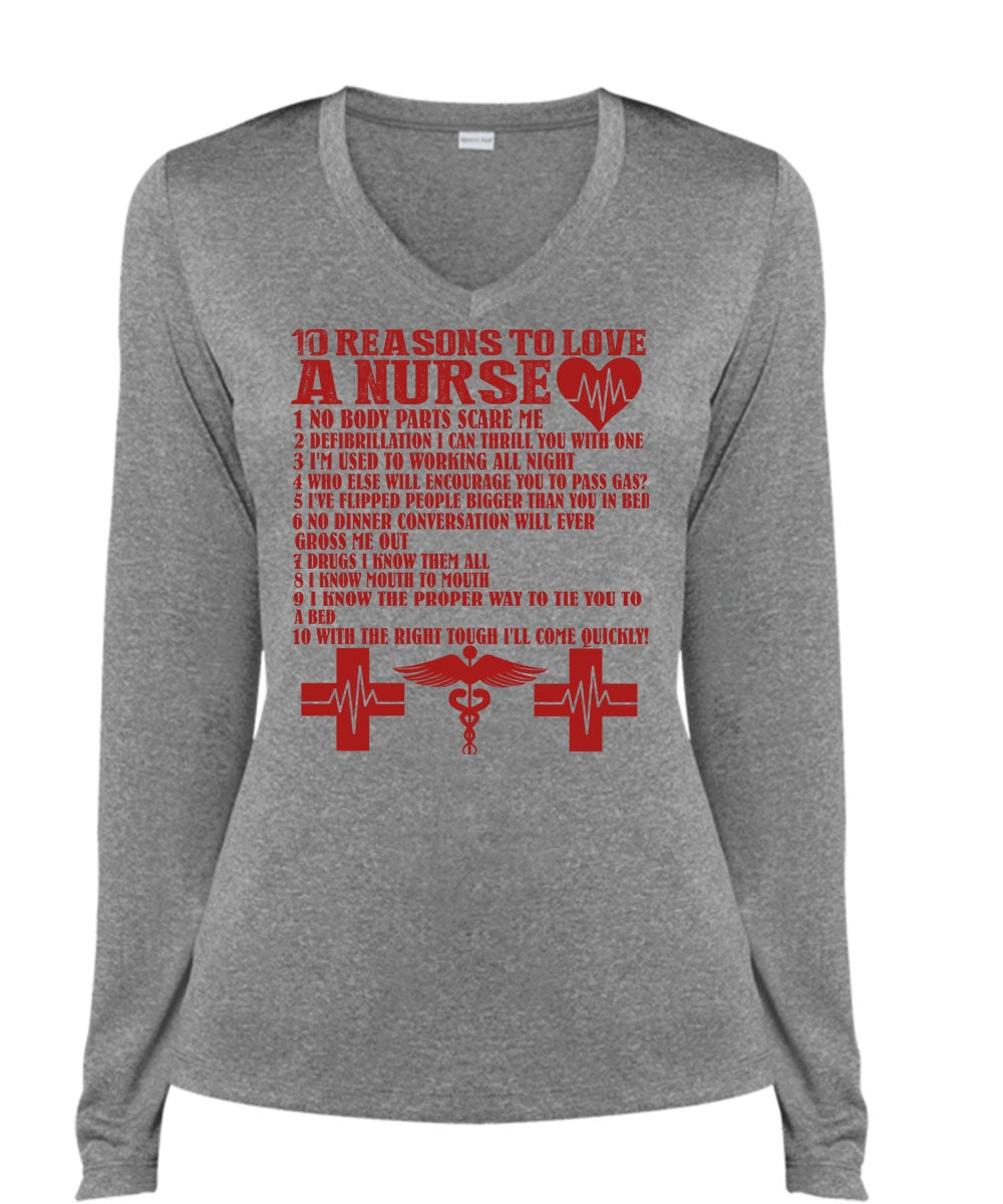 10 Reasons To Love A Nurse T Shirt, Being A Nurse T Shirt, Cool Shirt (Ladies LS Heather V-Neck)