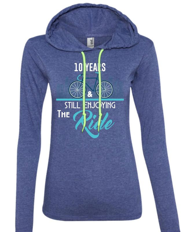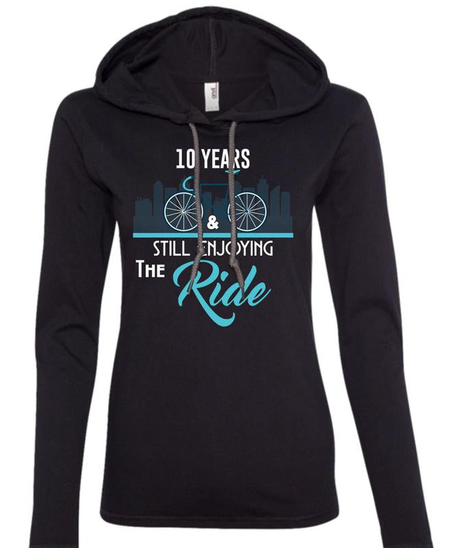 10 Years And Still Enjoying The Ride T Shirt, Being A Biker T Shirt (Anvil Ladies Ringspun Hooded)