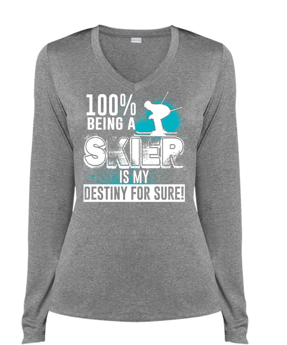 100% Being A Skier Is My Destiny For Sure T Shirt, I Love Skiing T Shirt, Cool Shirt (Ladies LS Heather V-Neck)