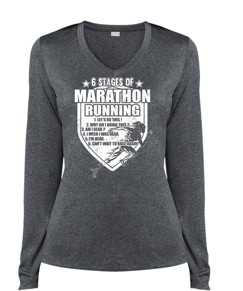 6 Stages Of Marathon Running T Shirt, Can't Wait To Race Again T Shirt, Cool Shirt (Ladies LS Heather V-Neck)