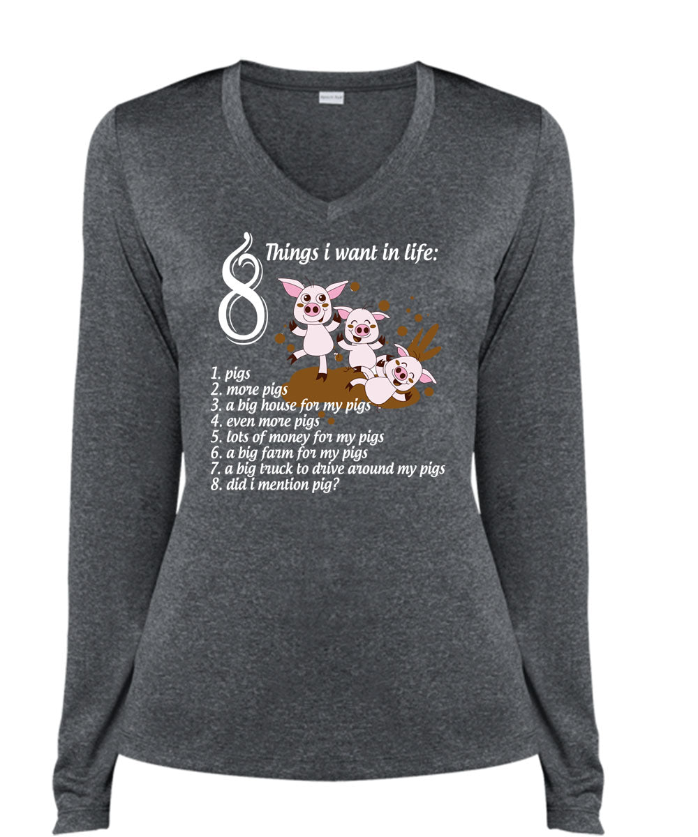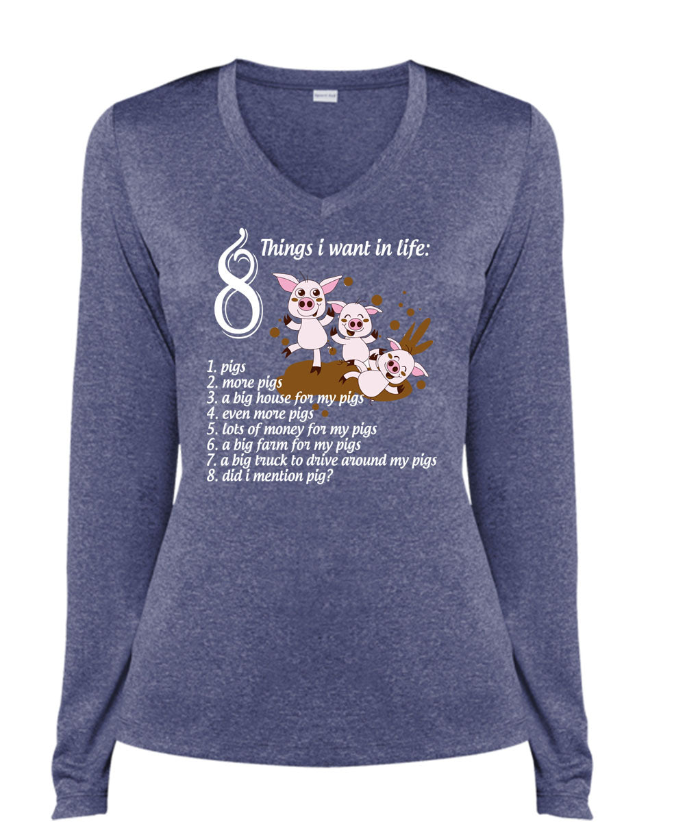 8 Things I Want In Life T Shirt, A Big Farm For My Pigs T Shirt, Cool Shirt (Ladies LS Heather V-Neck)