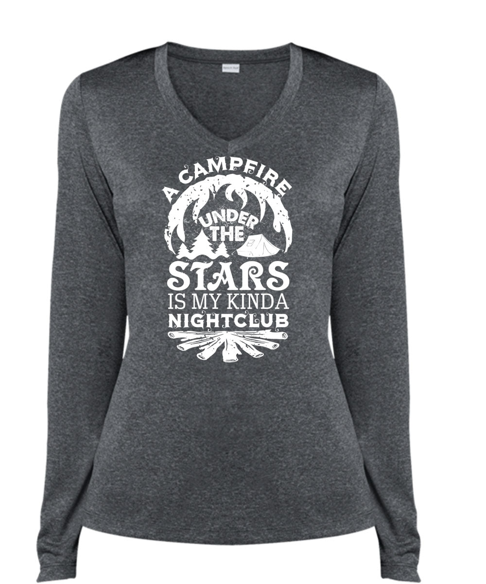 A Campfire Under The Stars Is My Kinda Nightclub T Shirt, Travel T Shirt (Ladies LS Heather V-Neck)