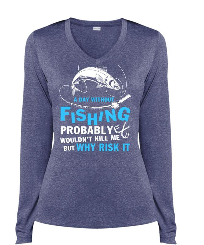 A Day Without Fishing T Shirt, Probably Wouldn't Kill Me T Shirt, Cool Shirt (Ladies LS Heather V-Neck)