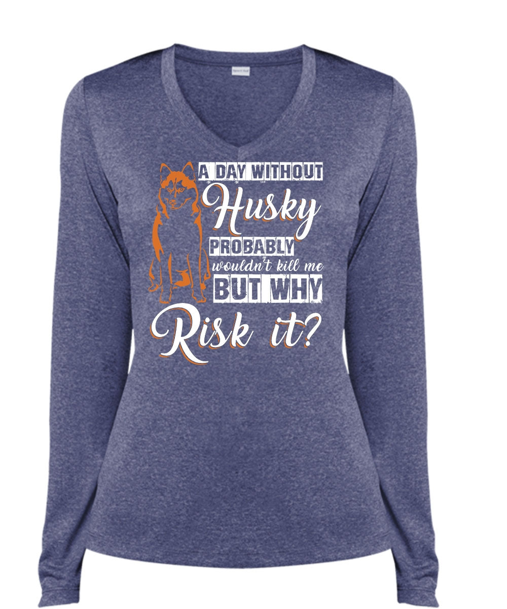 A Day Without Husky T Shirt, My Favorite T Shirt, Cool Shirt (Ladies LS Heather V-Neck)