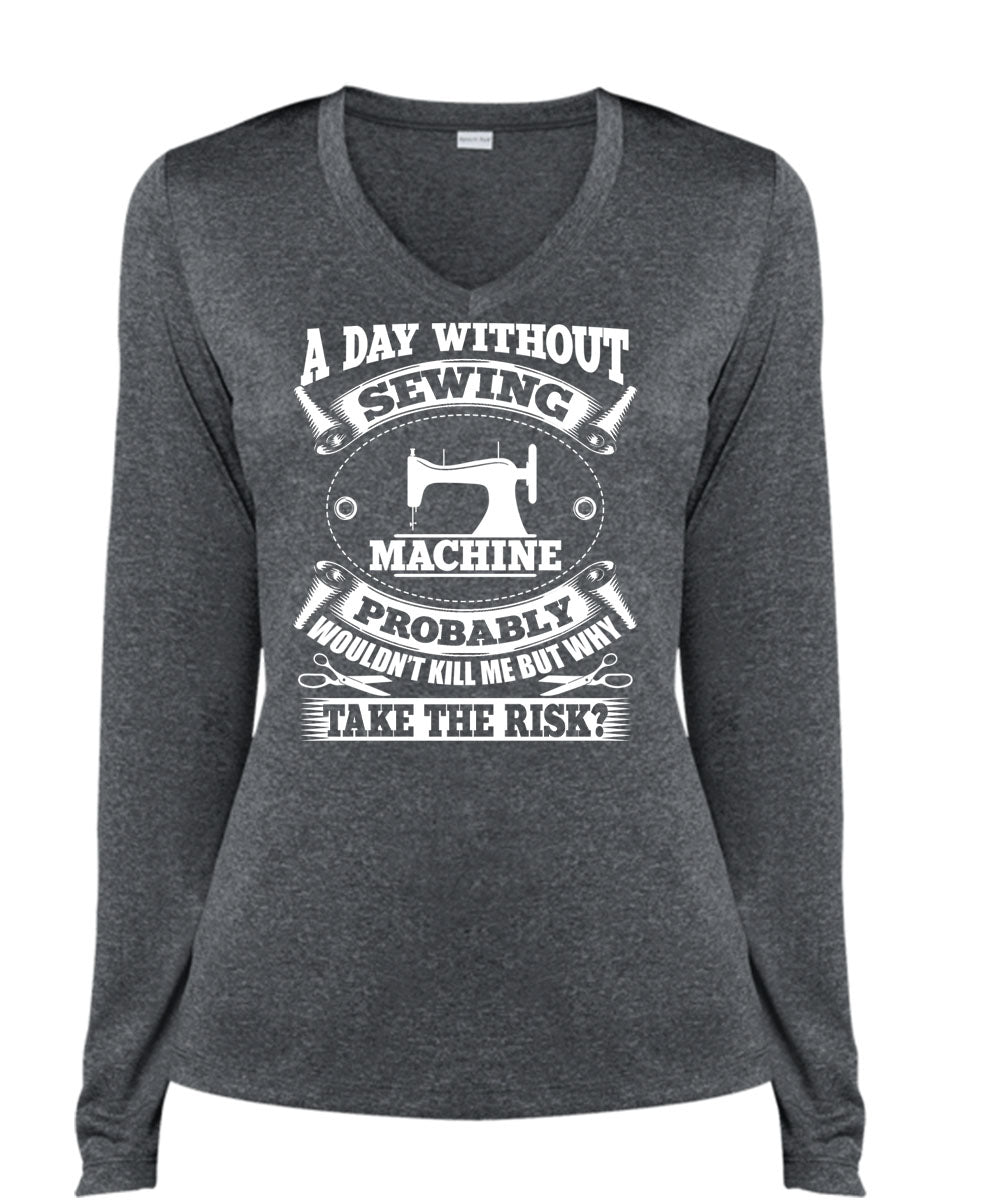 A Day Without Sewing Machine T Shirt, I Love Sewing T Shirt, Cool Shirt (Ladies LS Heather V-Neck)