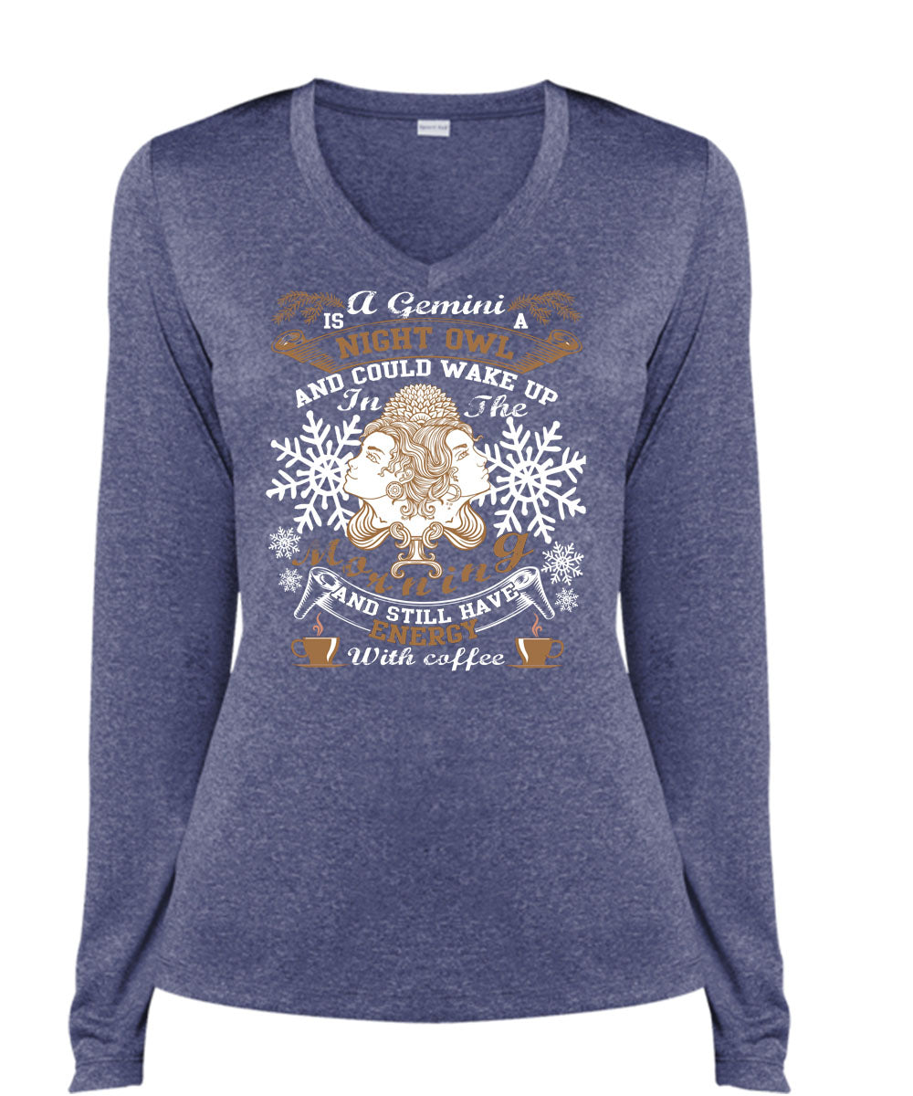 A Gemini Is A Night Owl T Shirt, Energy With Coffee T Shirt, Cool Shirt (Ladies LS Heather V-Neck)