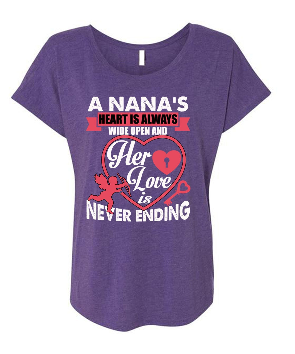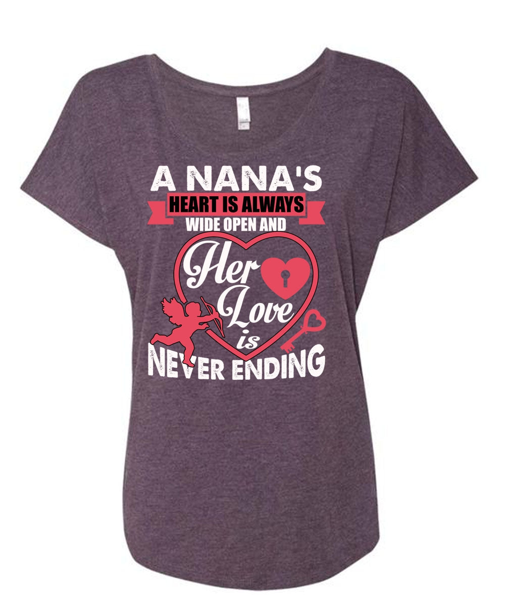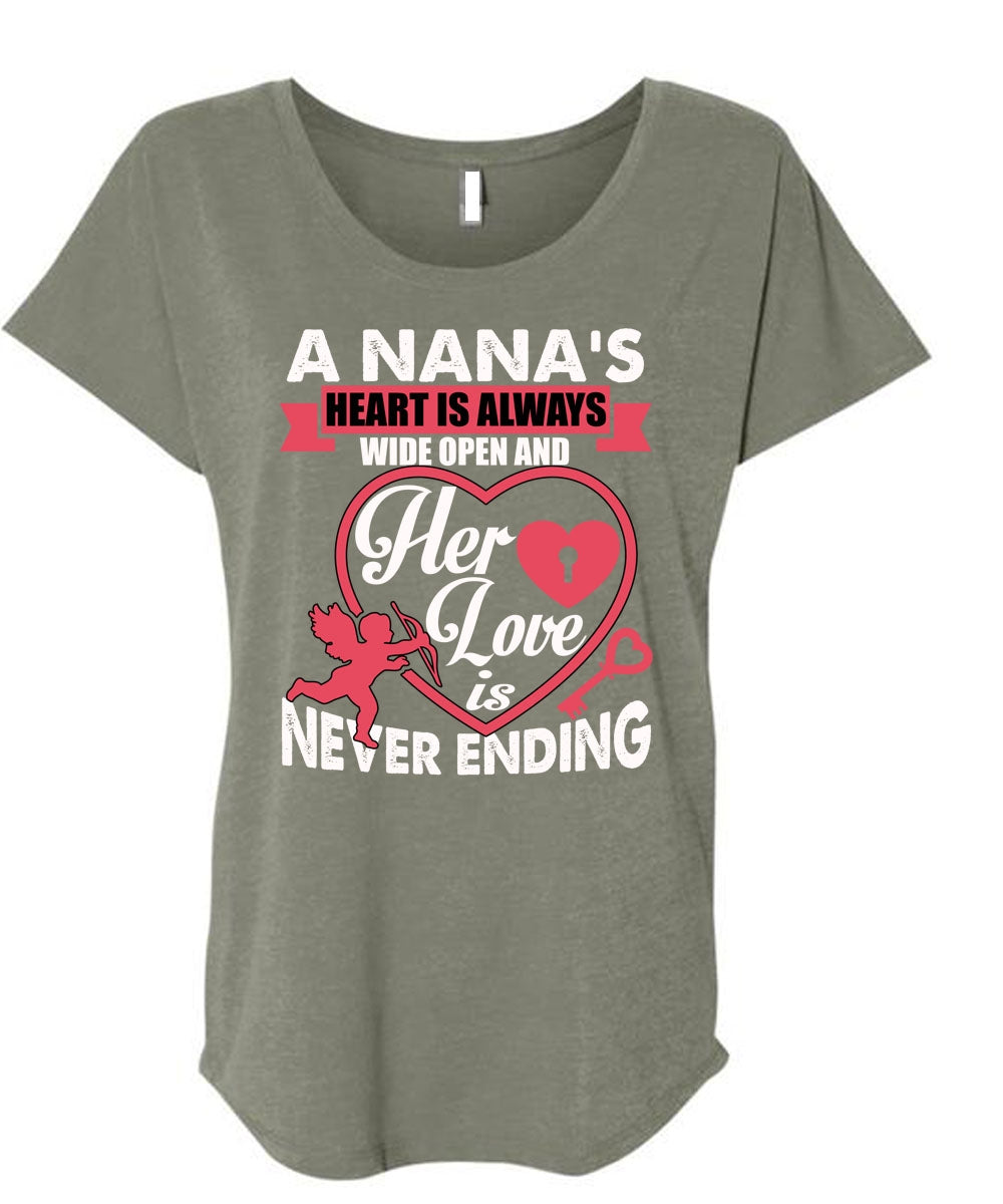 A Nana's Heart Is Always Wide Open T Shirt, Being A Nana T Shirt, Cool Shirt (Ladies' Triblend Dolman Sleeve)