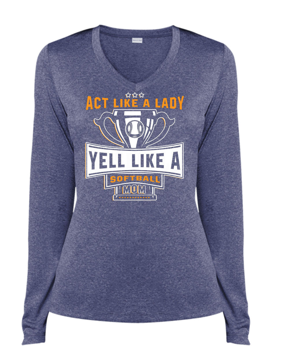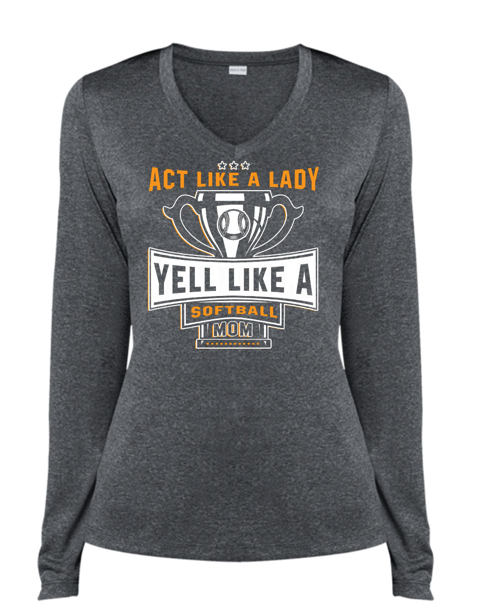 Activity Like A Lady Yell Like A Softball Mom T Shirt, I Love My Mom T Shirt, Cool Shirt (Ladies LS Heather V-Neck)