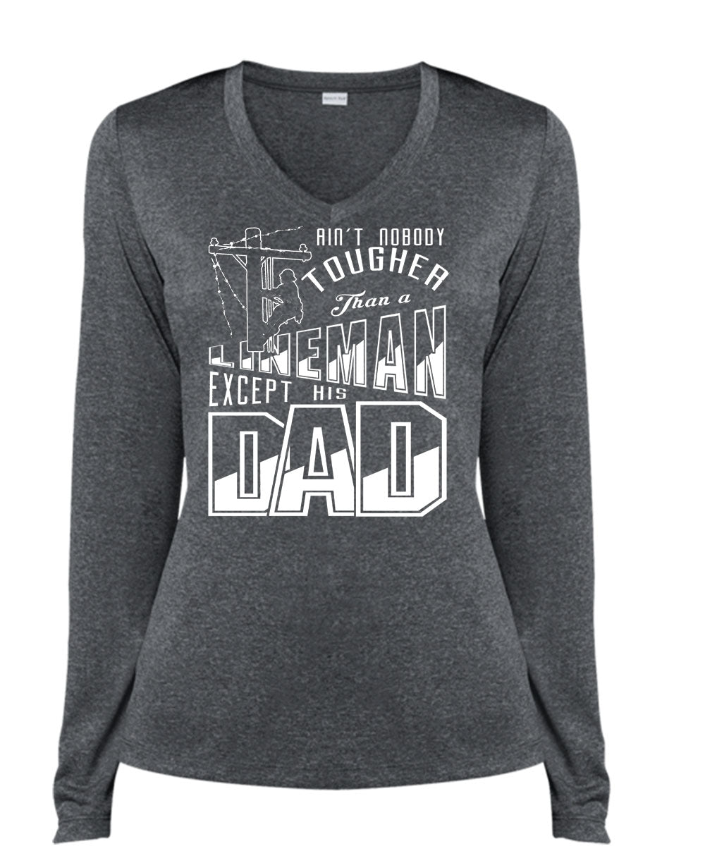 Ain't Nobody Tougher Than A Lineman Except His Dad T Shirt, Job T Shirt (Ladies LS Heather V-Neck)