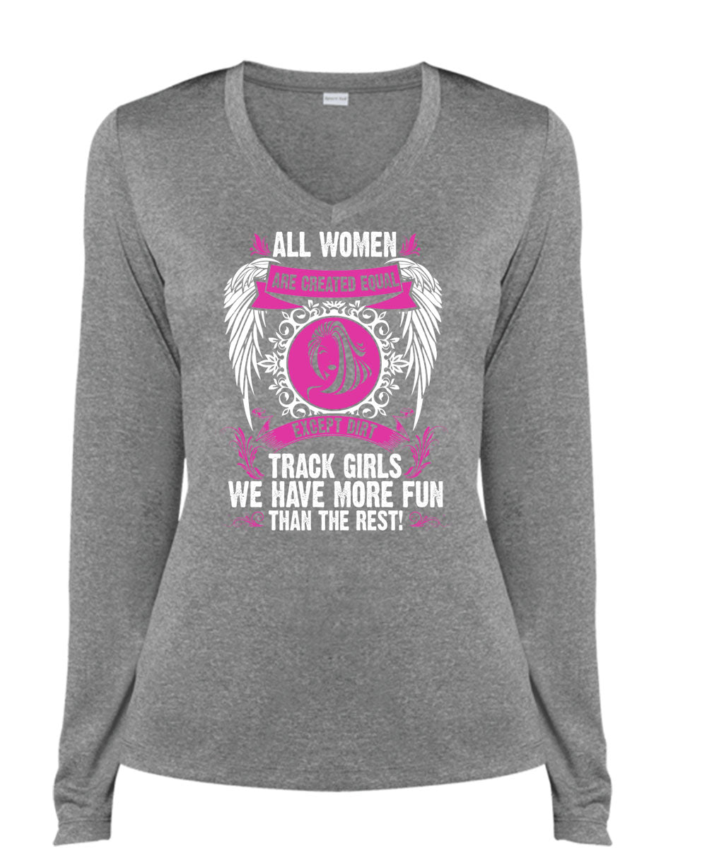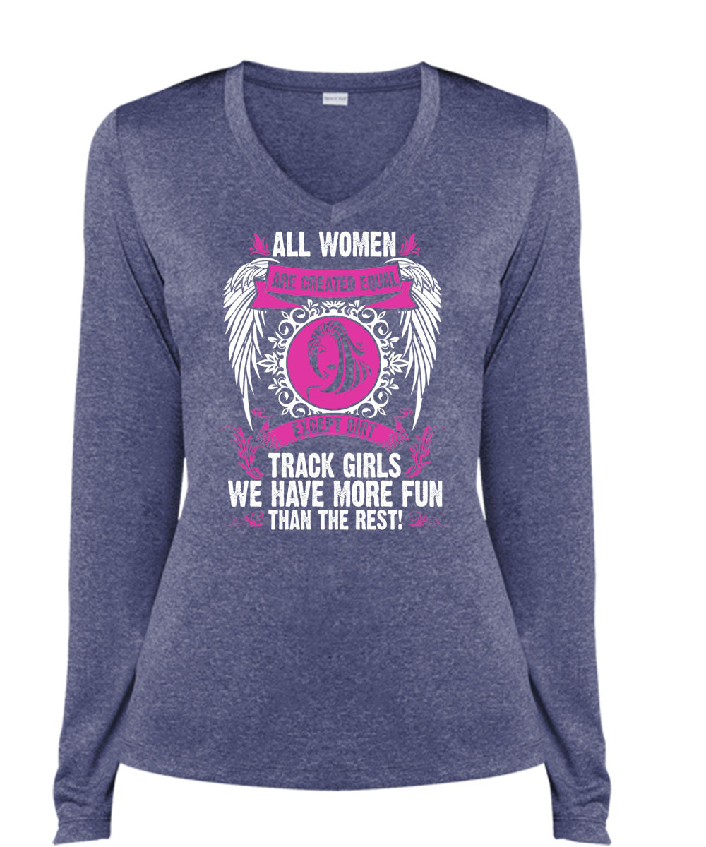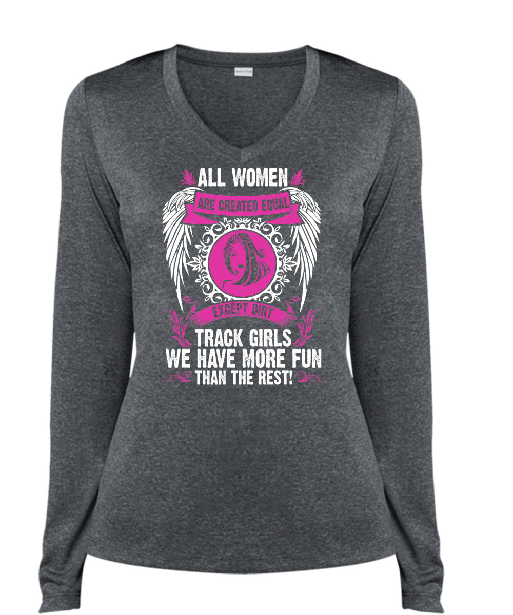 All Women Are Created Equal T Shirt, Except Dirt Track Girls T Shirt, Cool Shirt (Ladies LS Heather V-Neck)