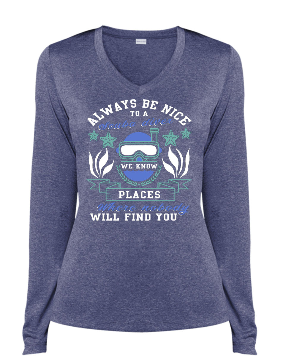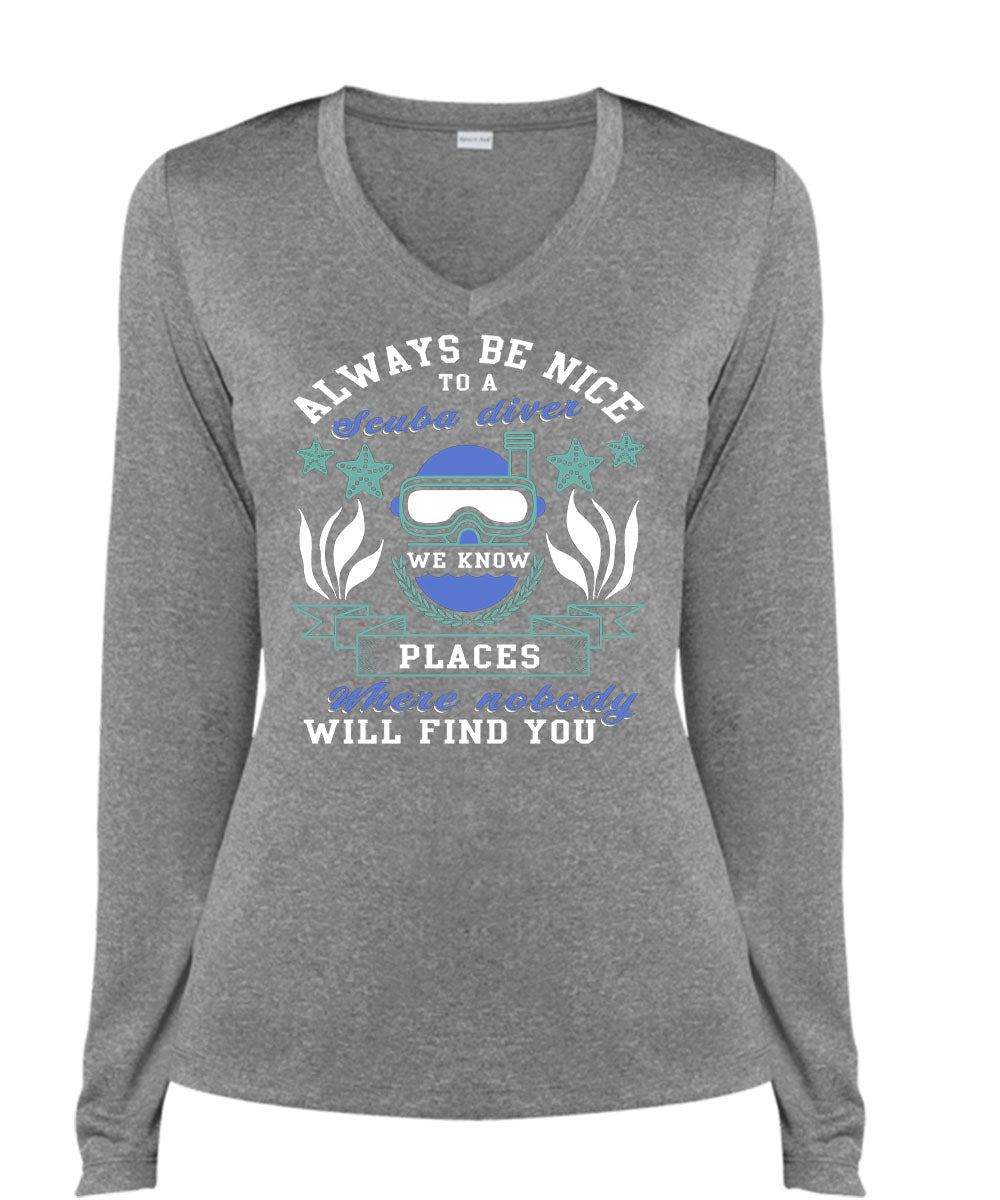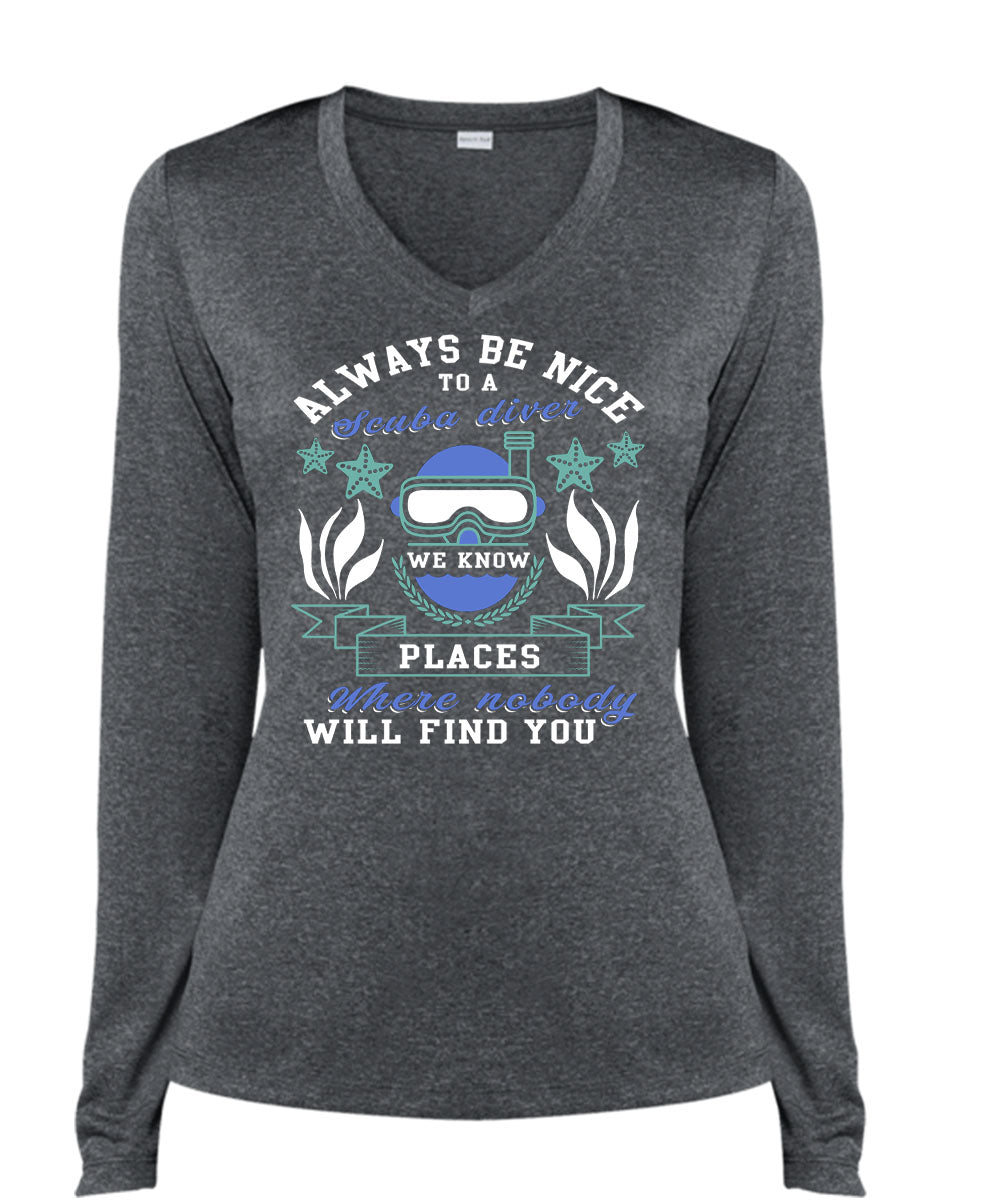 Always Be Nice To A Scuba Diver T Shirt, Nobody Will Find You T Shirt, Cool Shirt (Ladies LS Heather V-Neck)
