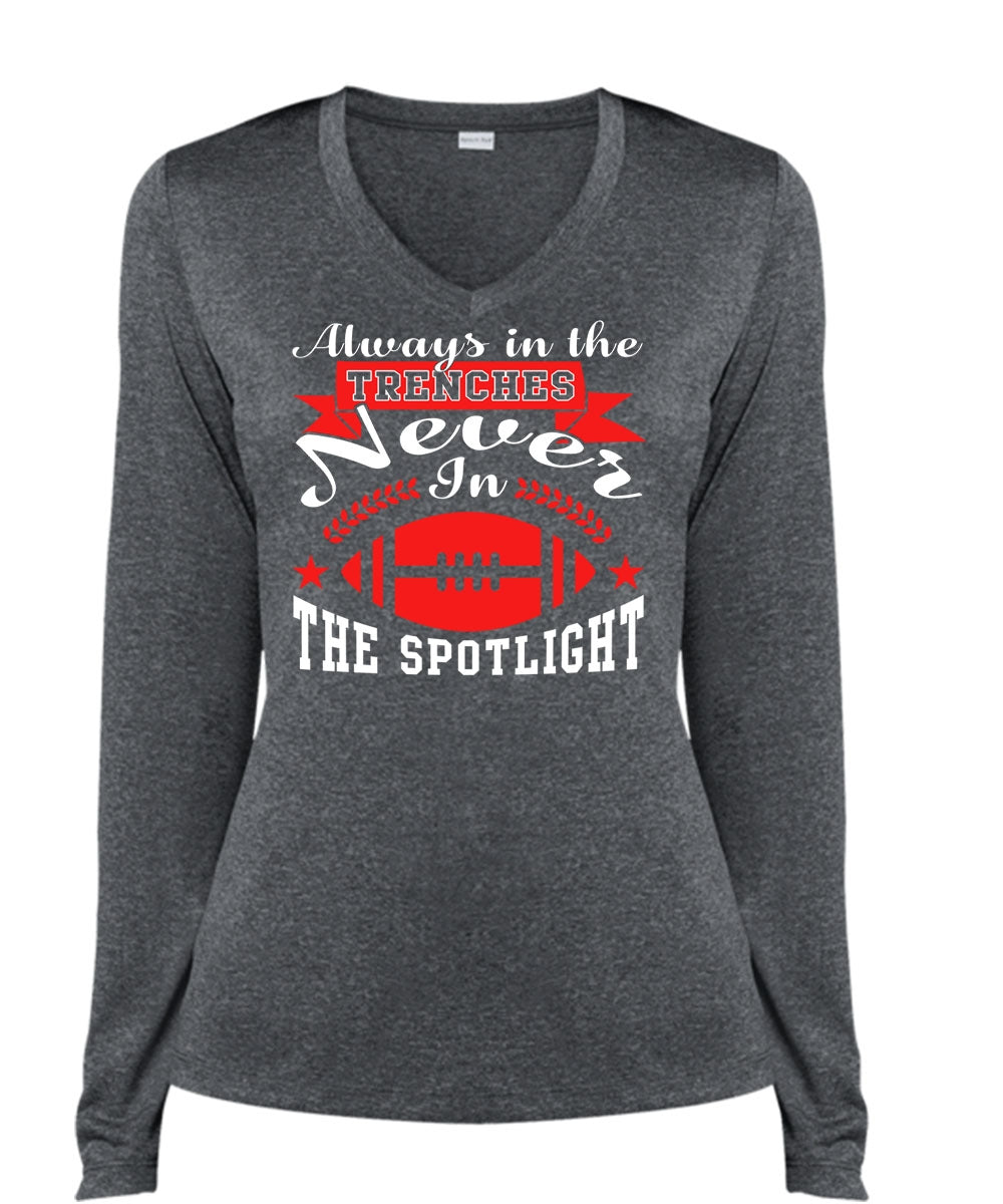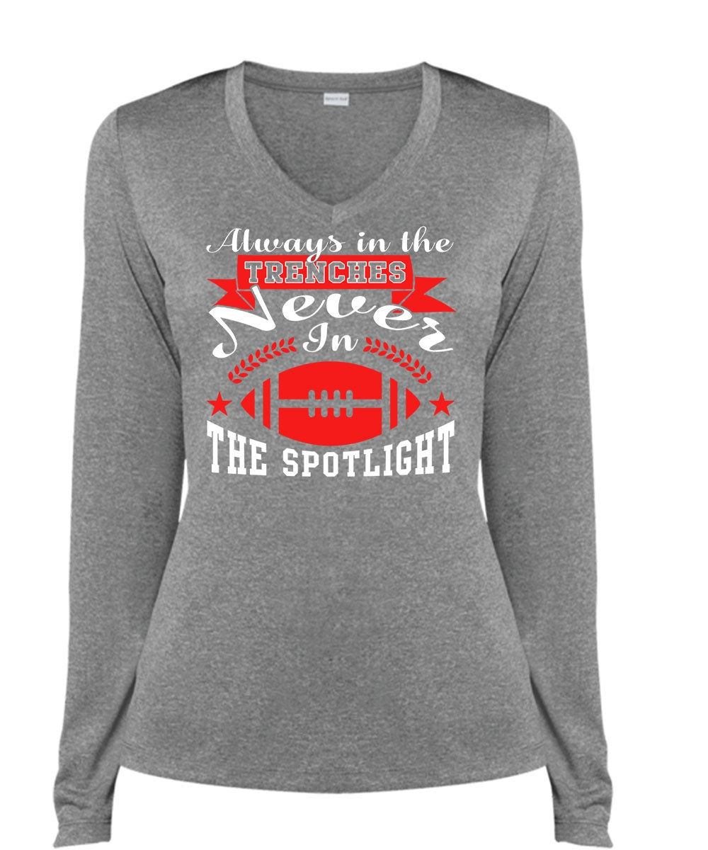 Always In The Trenches Never In The Spotlight T Shirt, I Love Rugby T Shirt, Cool Shirt (Ladies LS Heather V-Neck)