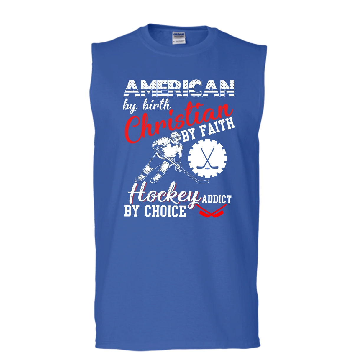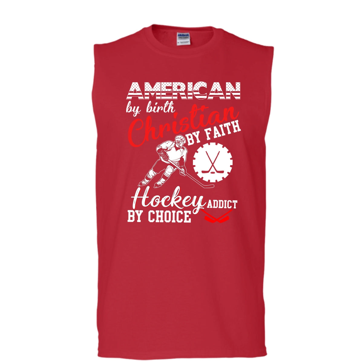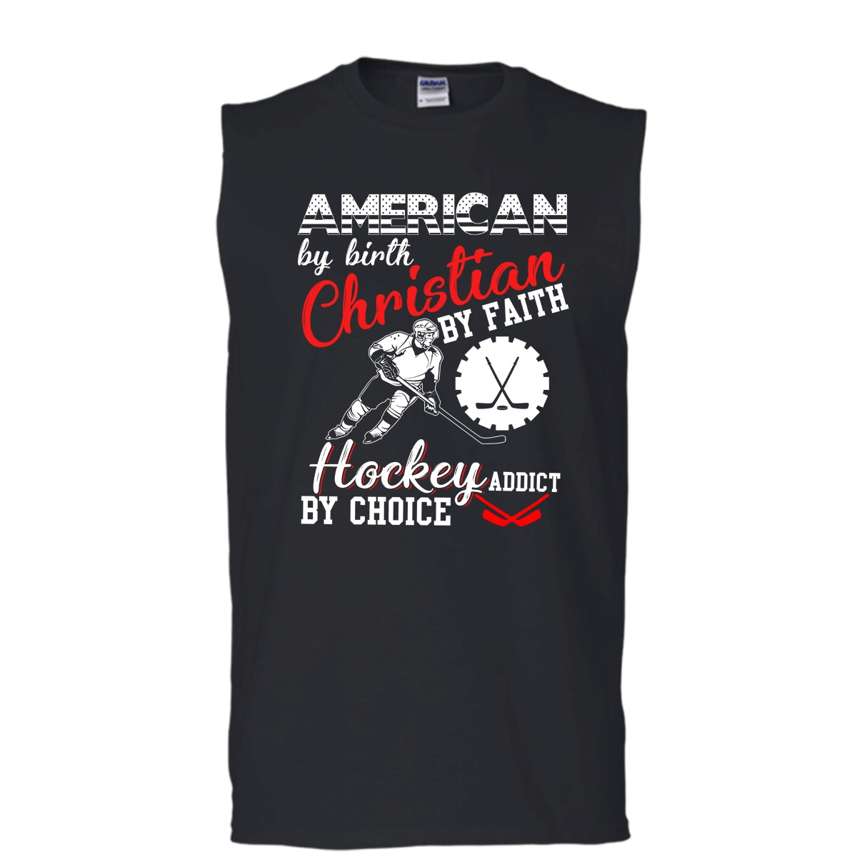American By Birth Christian By Faith T Shirt, Hockey Addict By Choice T Shirt, Cool T Shirt (Men's Cotton Sleeveless)