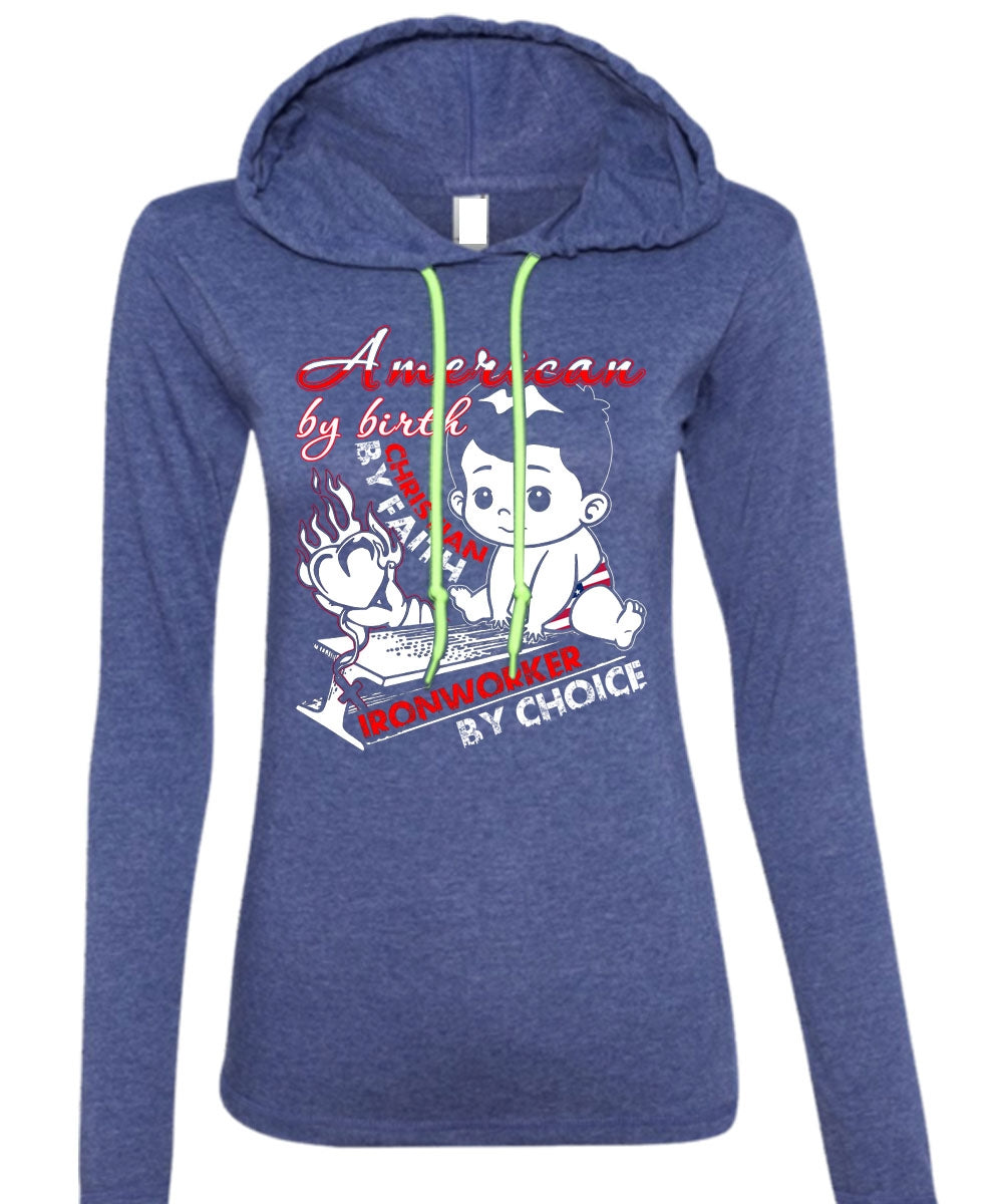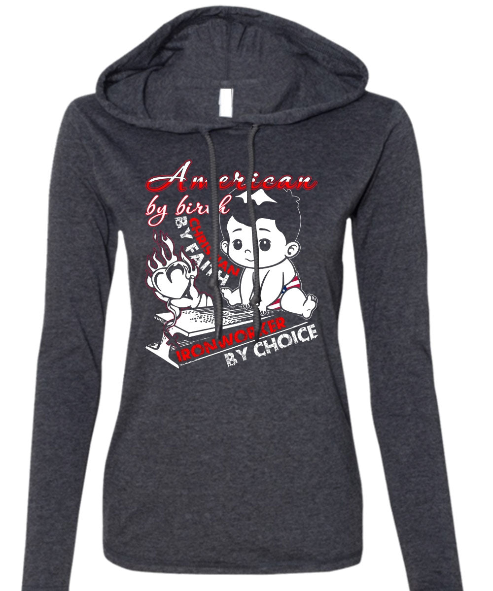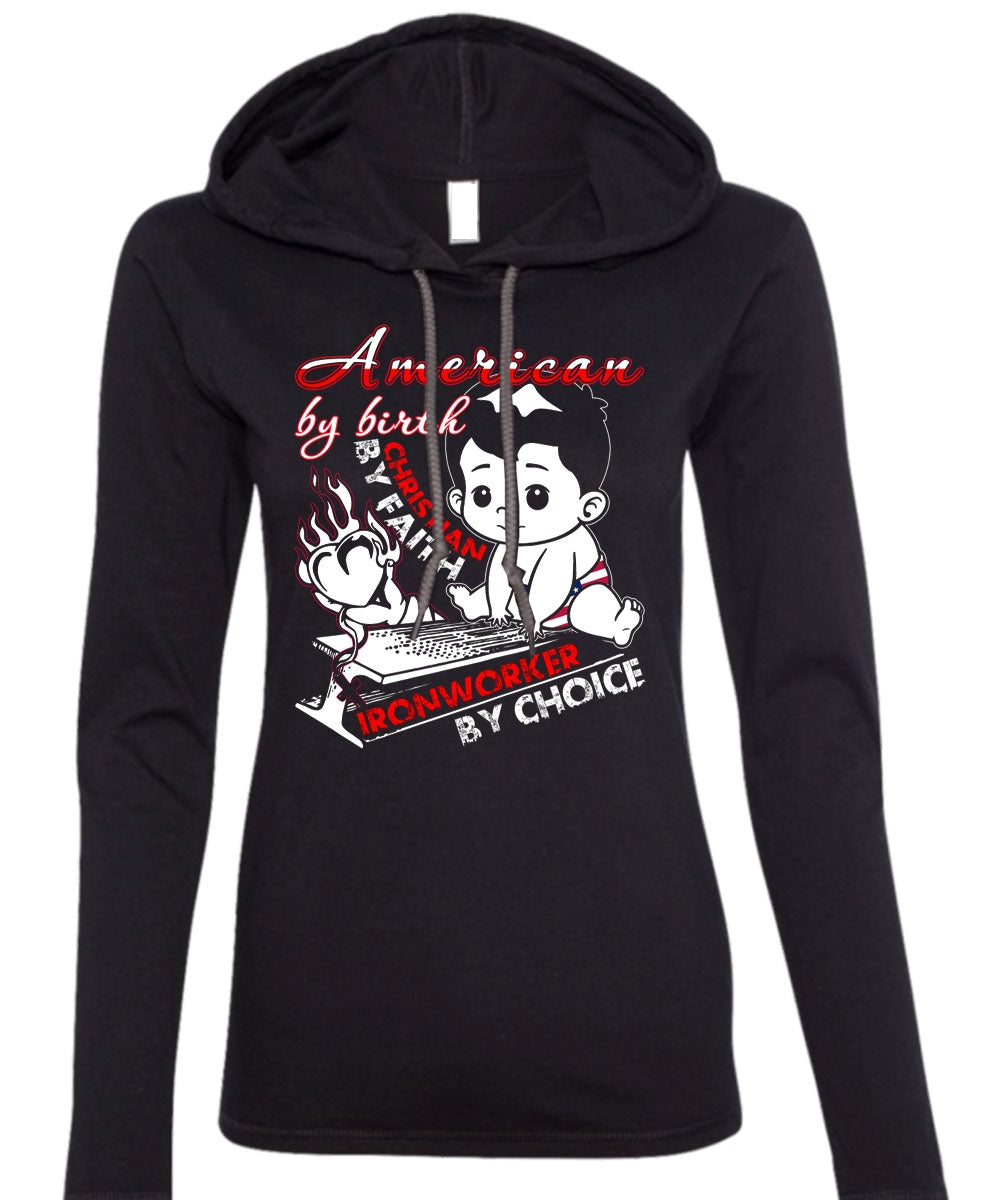 American By Birth T Shirt, Ironworker By Choice T Shirt (Anvil Ladies Ringspun Hooded)