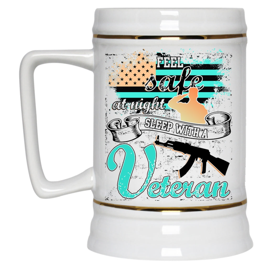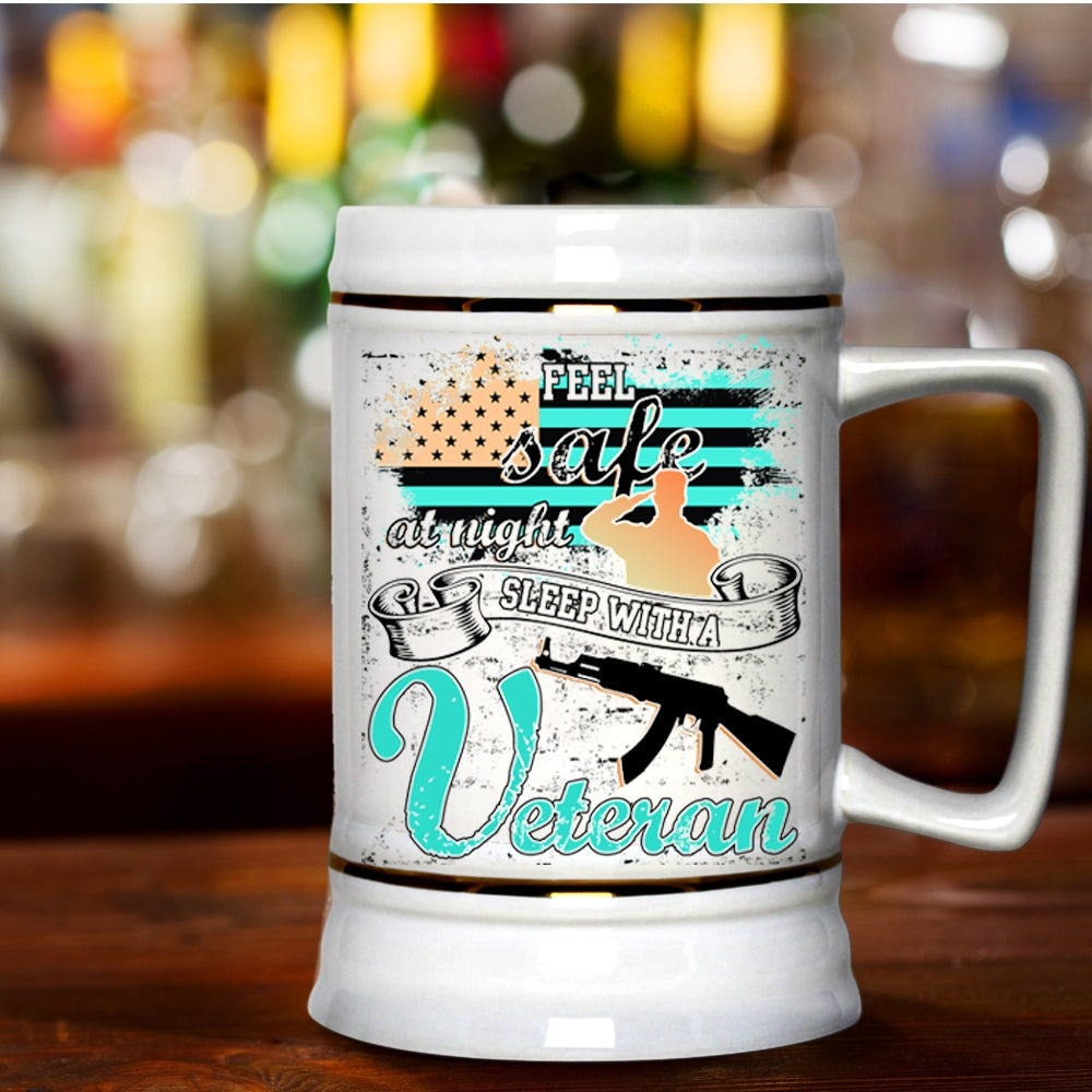American Flag Beer Stein 22oz, Feel Safe At Night Sleep With A Veteran Beer Mug