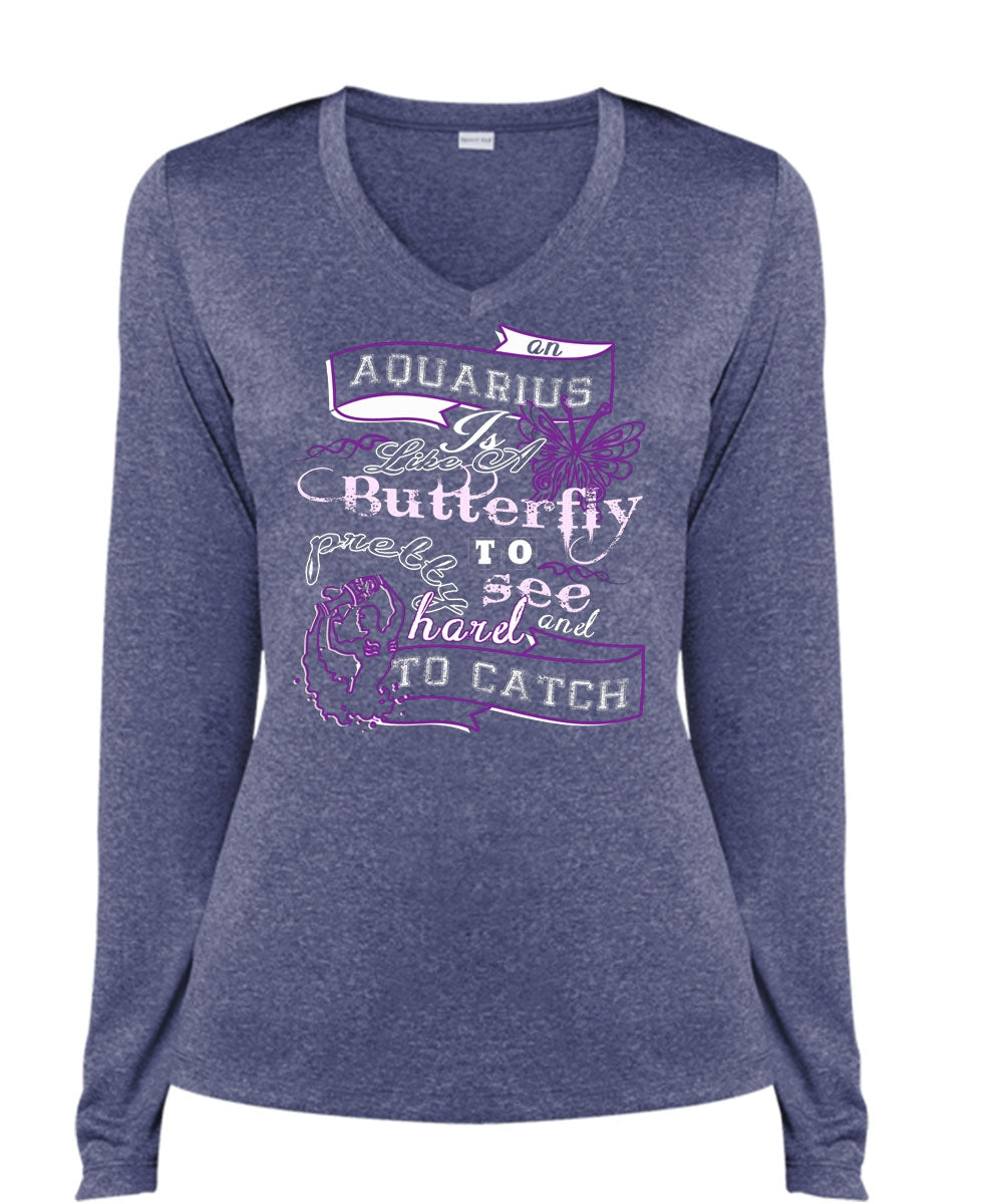 An Aquarius Is Like A Butterfly To See And Too Catch Pretty Harel T Shirt (Ladies LS Heather V-Neck)