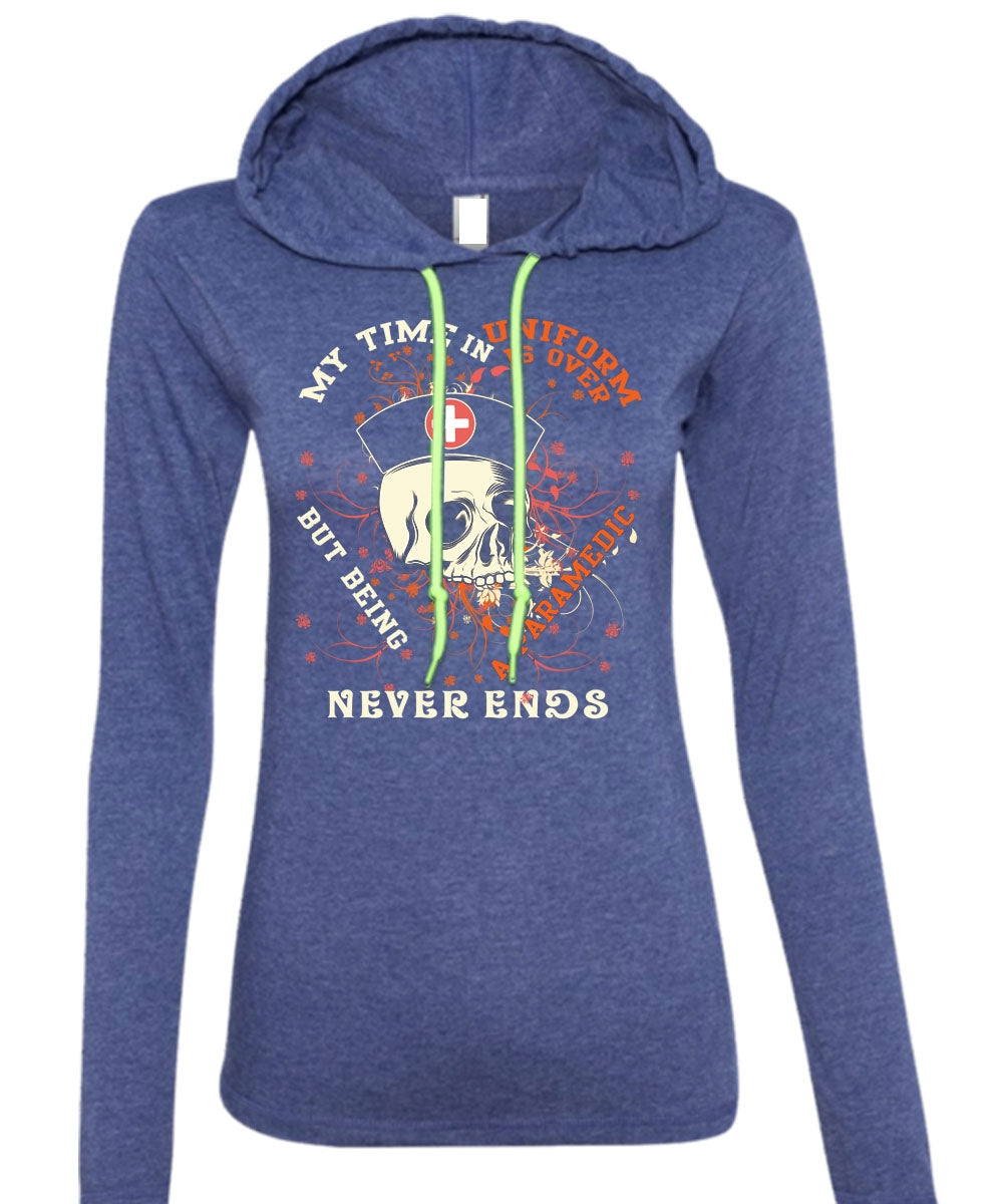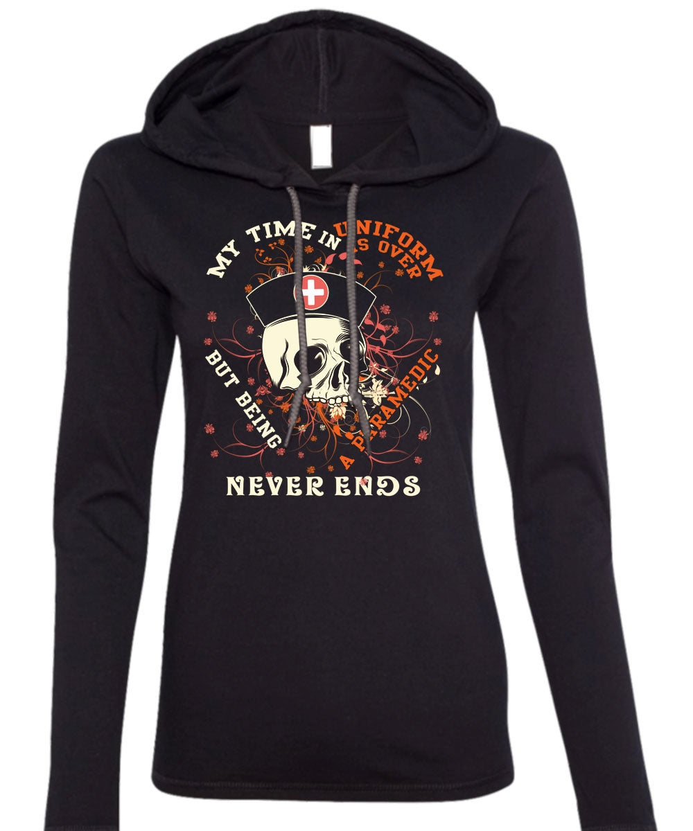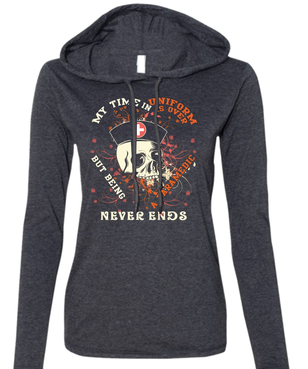 Being A Paramedic Never Ends T Shirt, My Time In Uniform Is Over T Shirt (Anvil Ladies Ringspun Hooded)