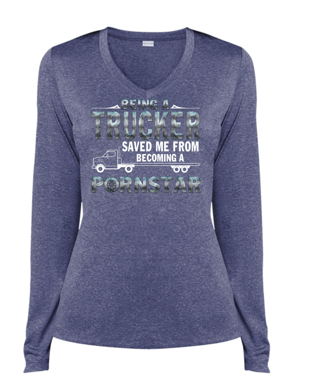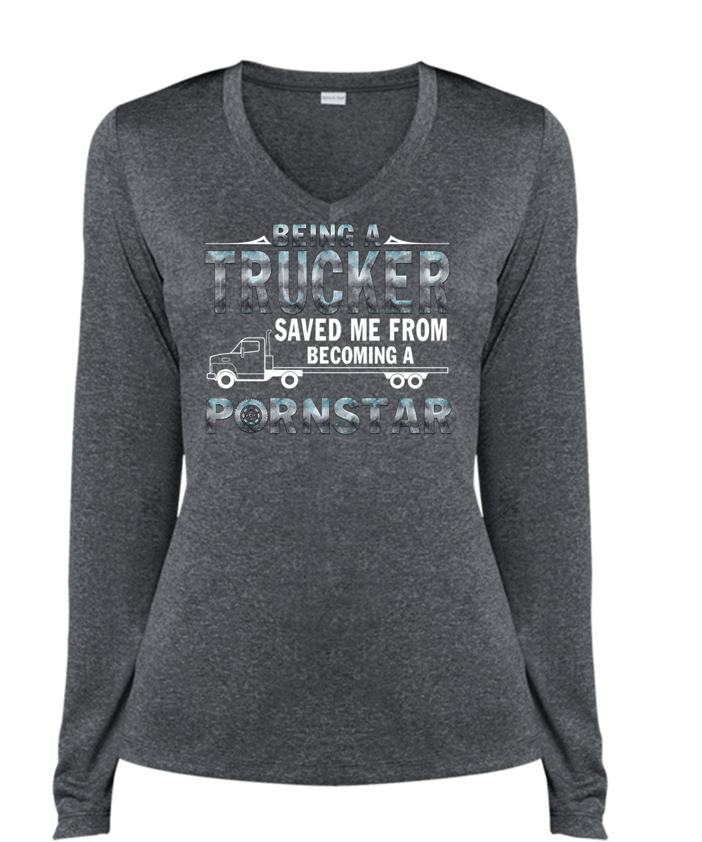 Being A Trucker T Shirt, I Love Trucking T Shirt, Cool Shirt (Ladies LS Heather V-Neck)