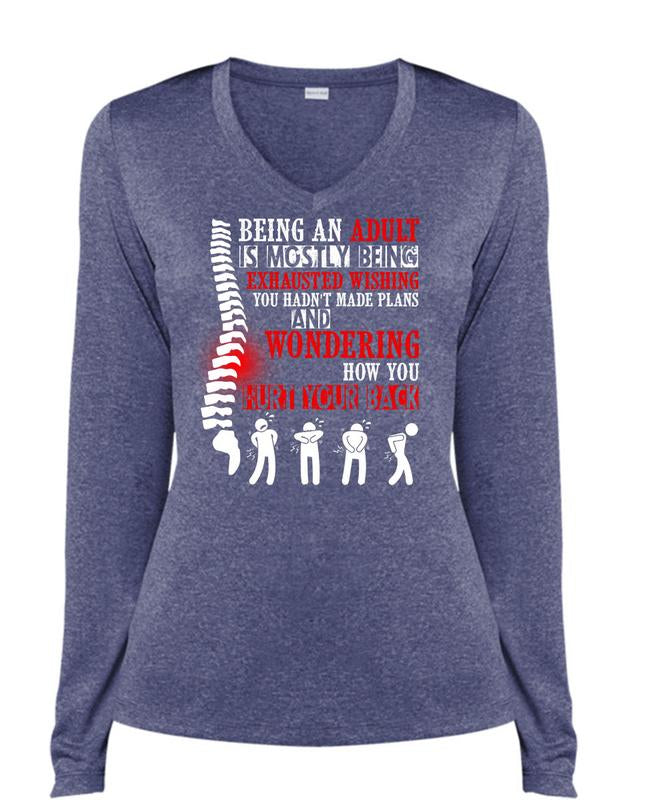 Being An Adult Is Mostly T Shirt, Hurt Your Back T Shirt, Cool Shirt (Ladies LS Heather V-Neck)