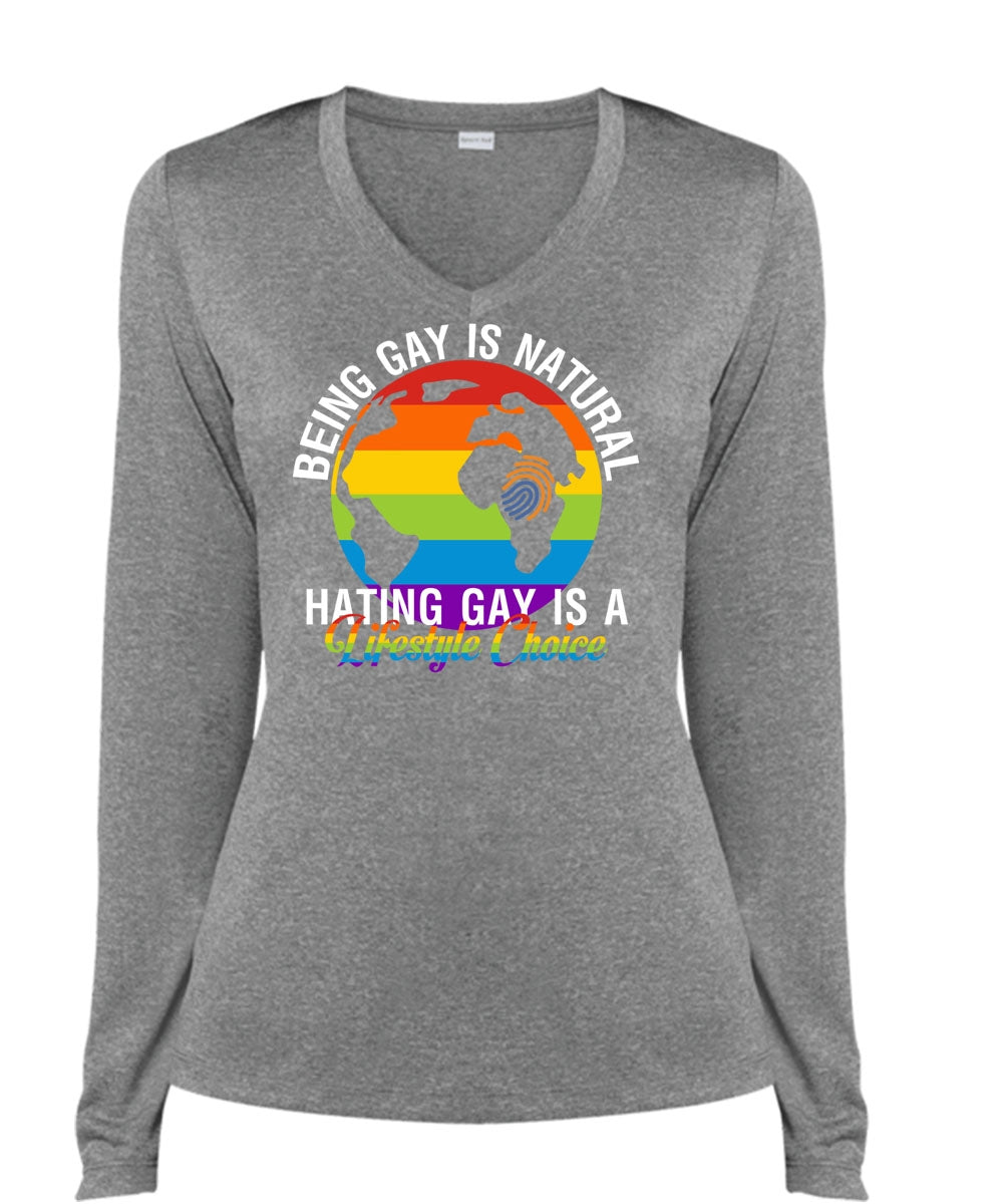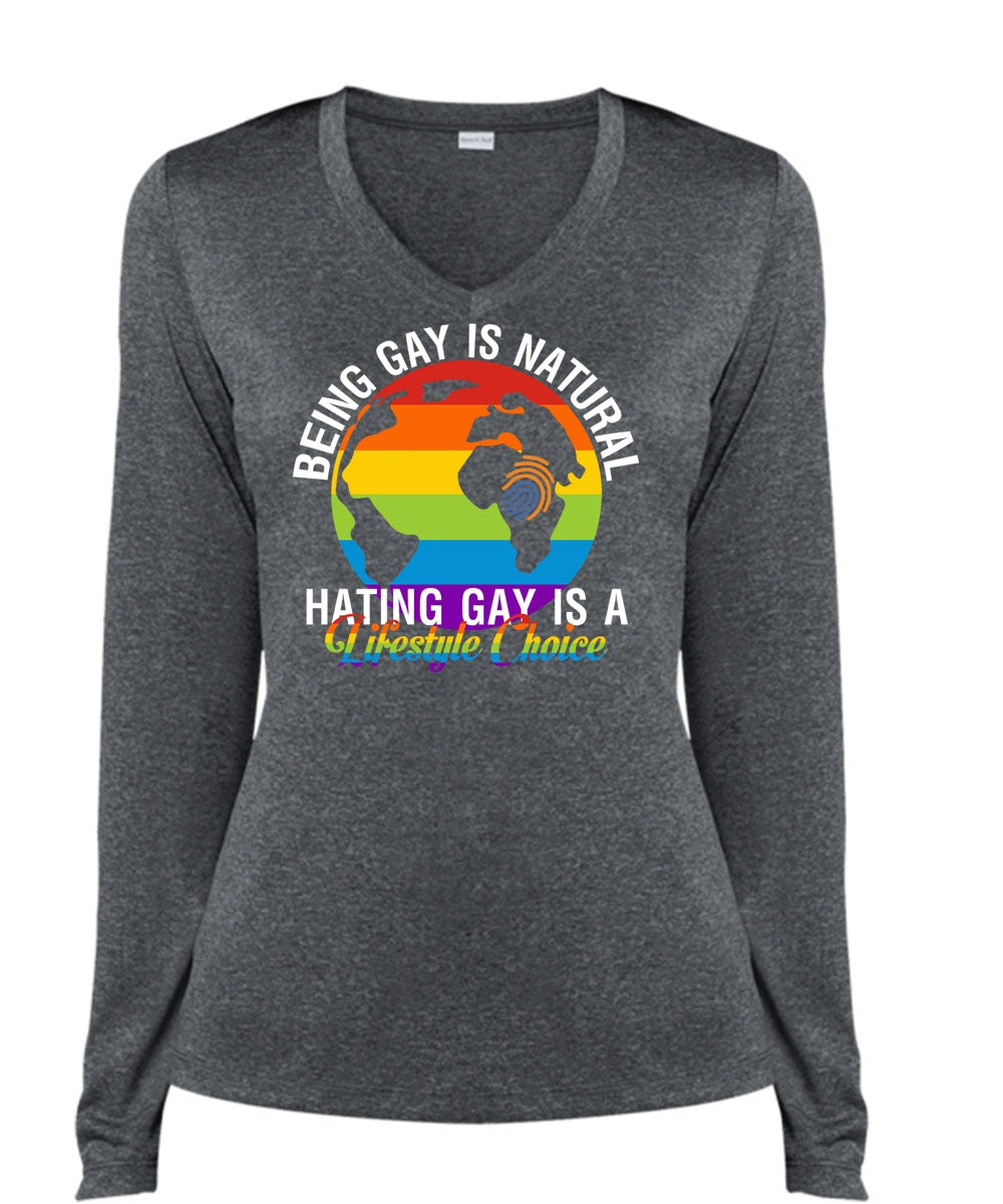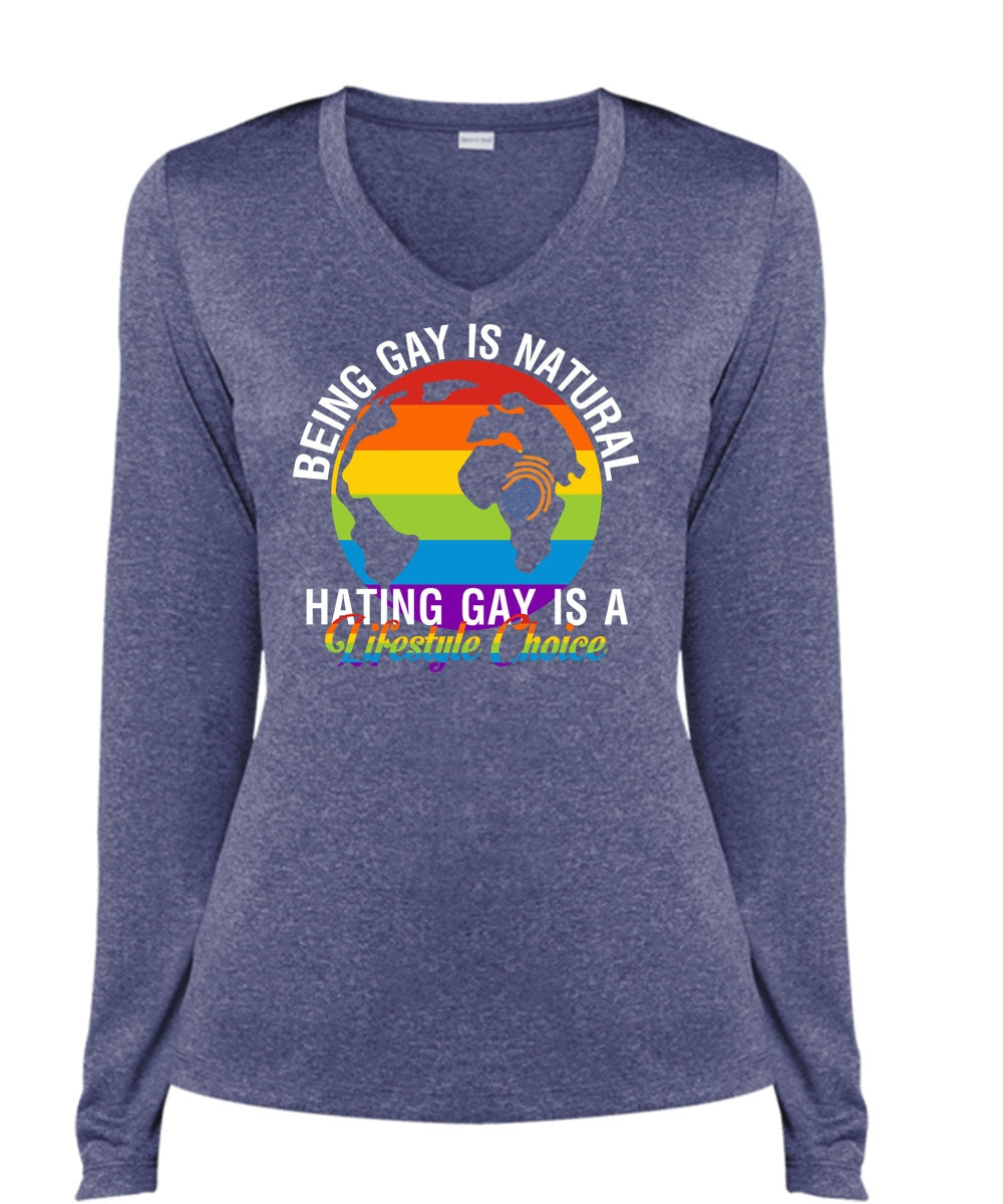 Being Gay Is Natural T Shirt, Hating Gay Is A Lifestyle Choice T Shirt, Cool Shirt (Ladies LS Heather V-Neck)