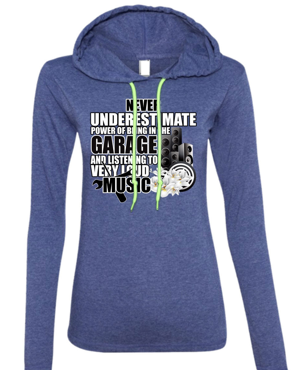Being In The Garage T Shirt, Listening To Very Loud Music T Shirt (Anvil Ladies Ringspun Hooded)