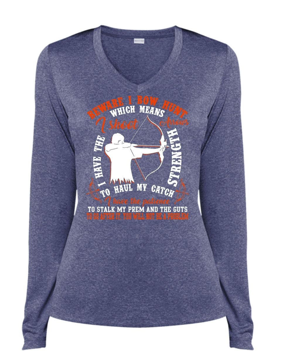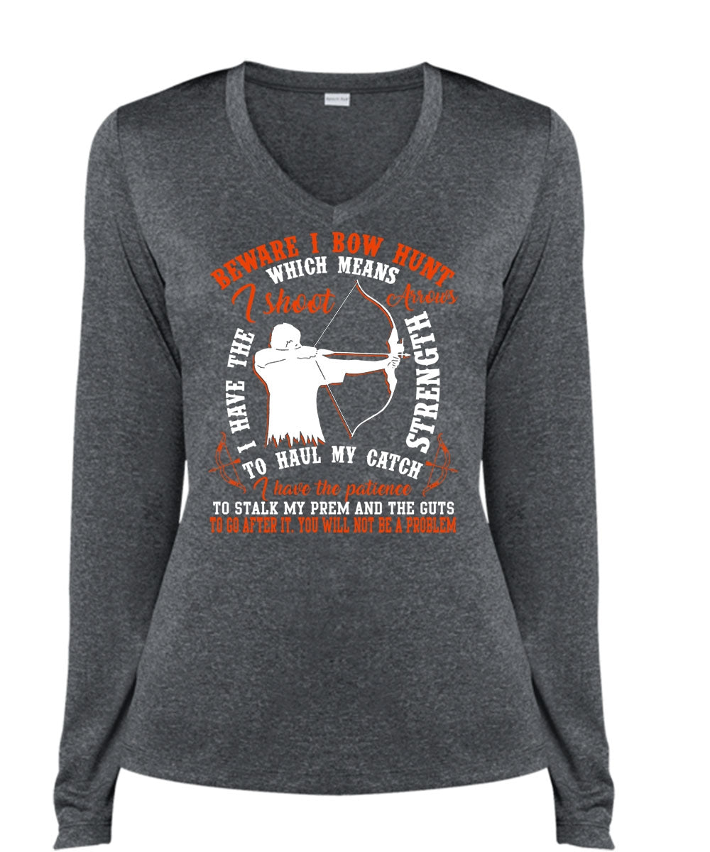 Beware I Bow Hunt T Shirt, I Shoot Arrows T Shirt, Cool Shirt (Ladies LS Heather V-Neck)