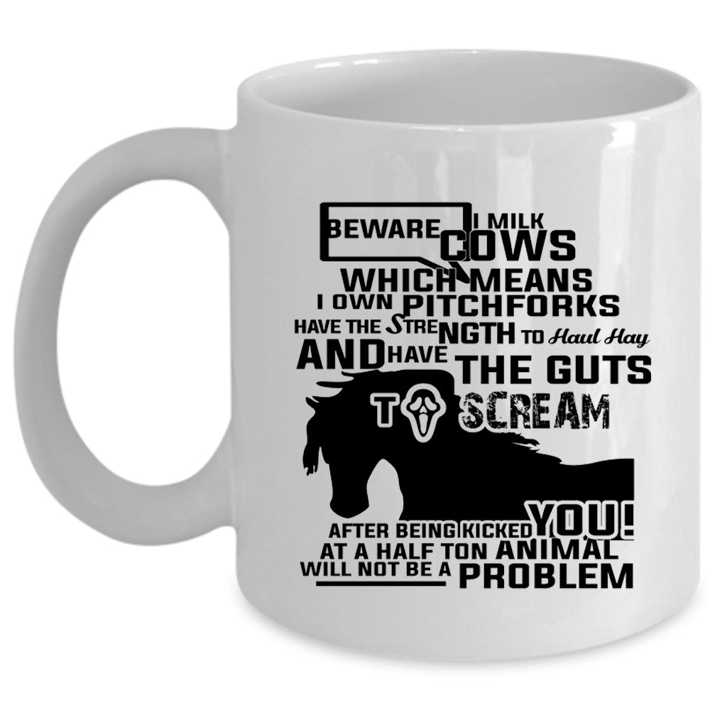 Beware I Milk Cows I Own Pitchforks Cup, Funny Mug (Coffee Mug - White)