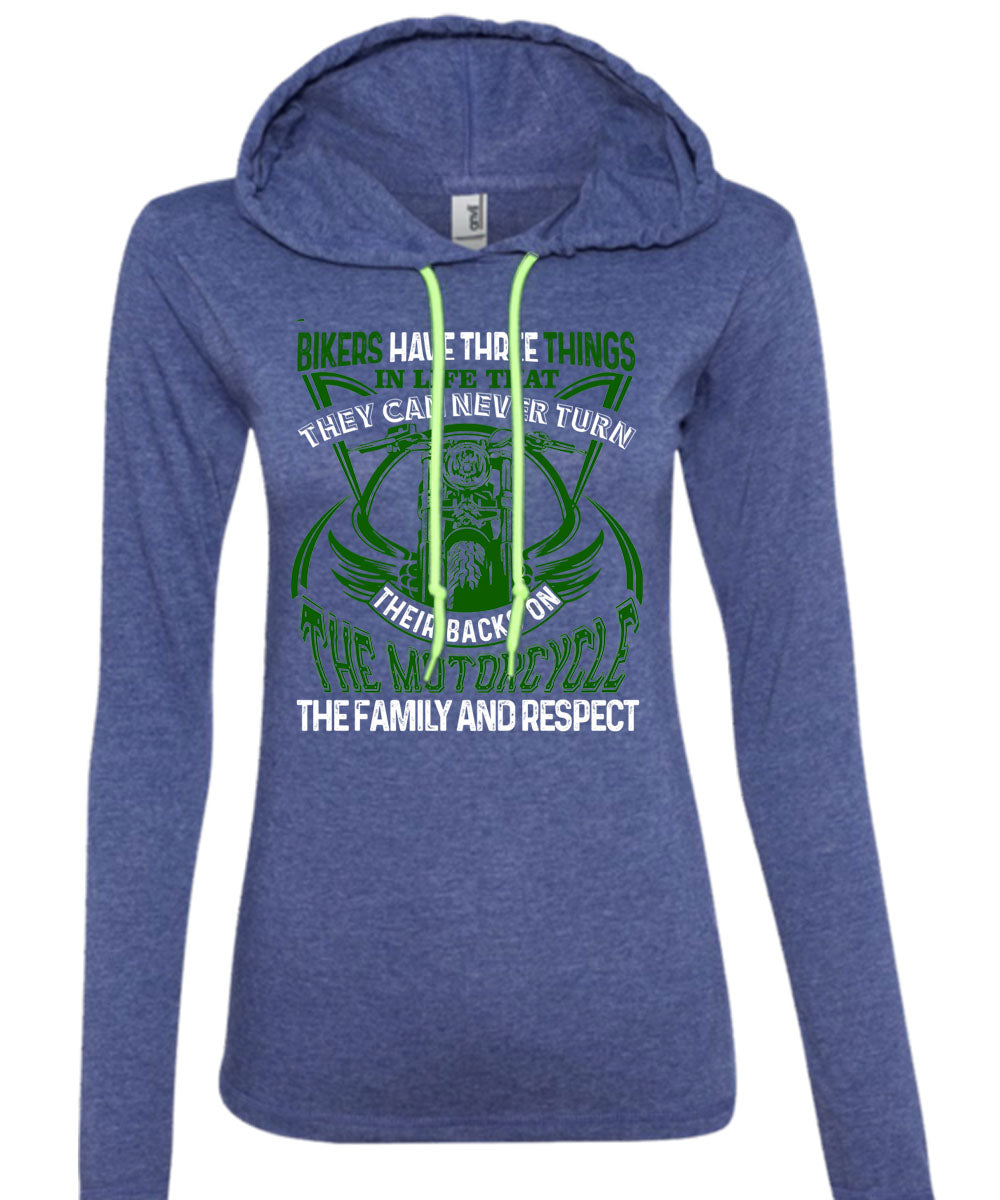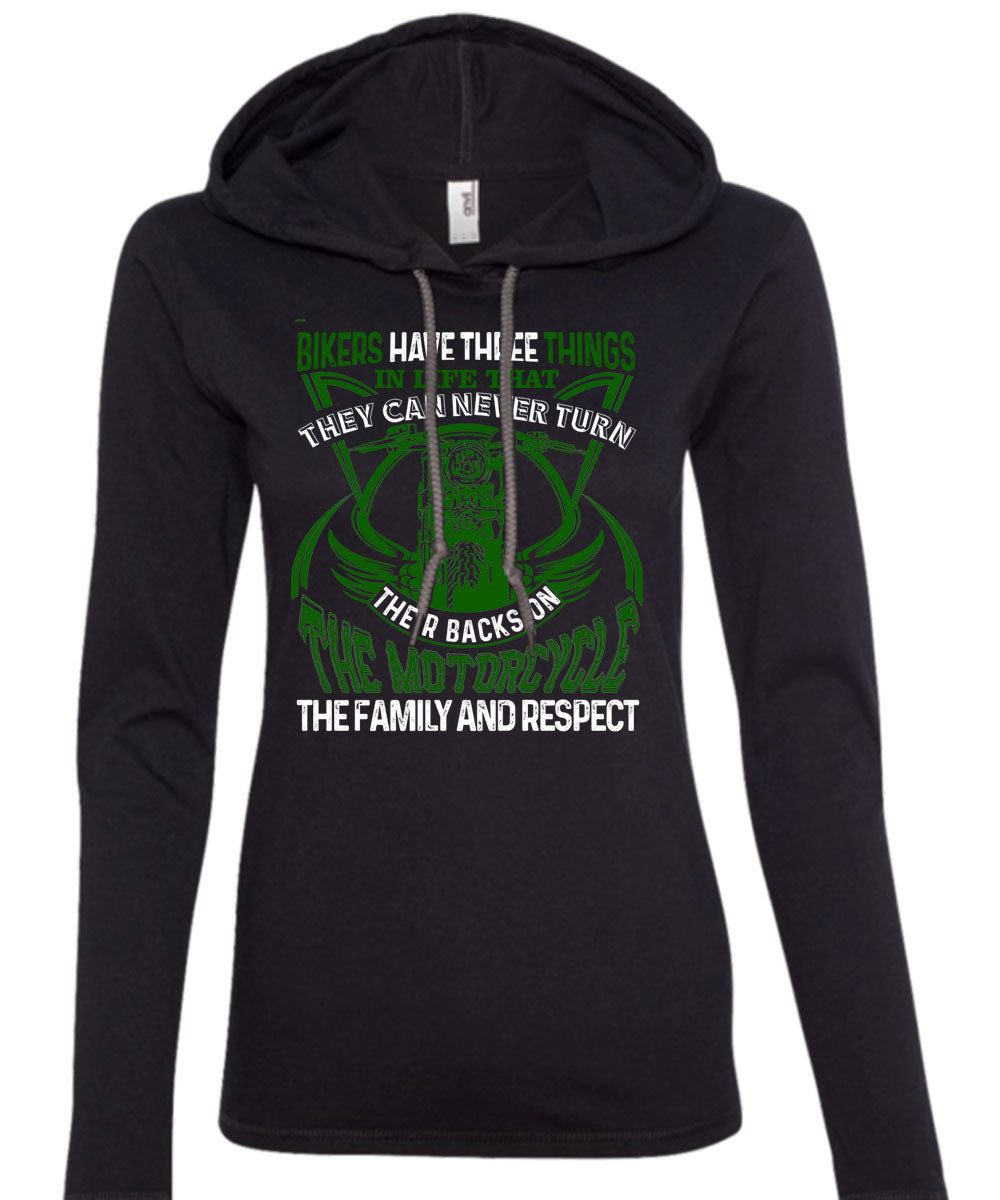 Bikers Have Three Things In Life T Shirt, The Motorcycle The Family And Respect T Shirt (Anvil Ladies Ringspun Hooded)