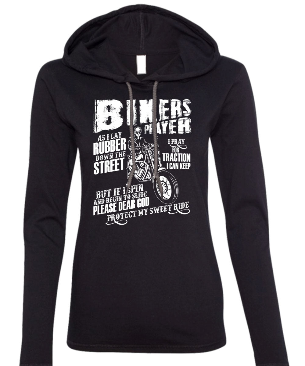 Bikers Prayer T Shirt, I Lay Rubber Down The Street T Shirt (Anvil Ladies Ringspun Hooded)
