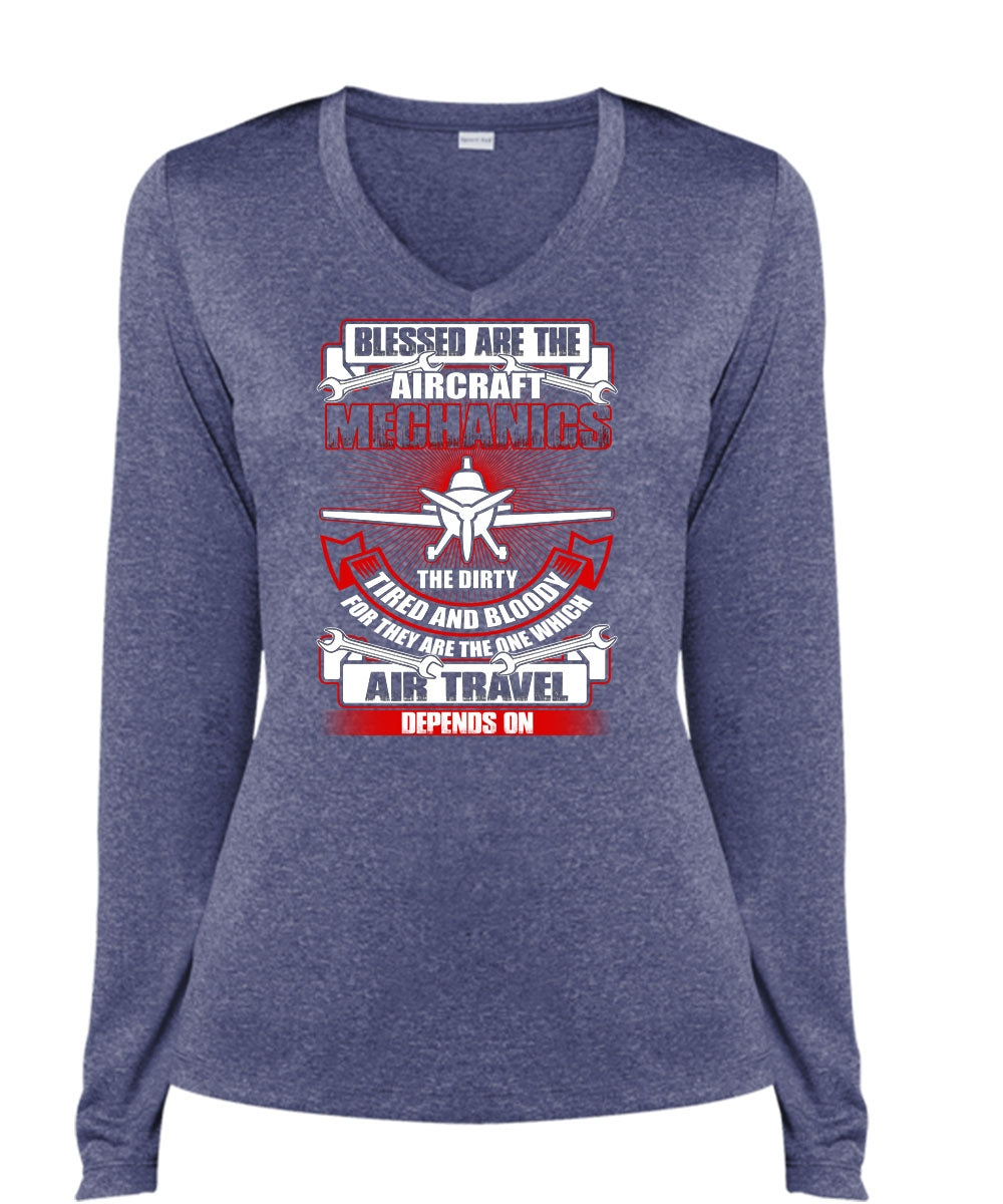Blessed Are The Aircraft Mechanics T Shirt, Air Travel T Shirt, Cool Shirt (Ladies LS Heather V-Neck)