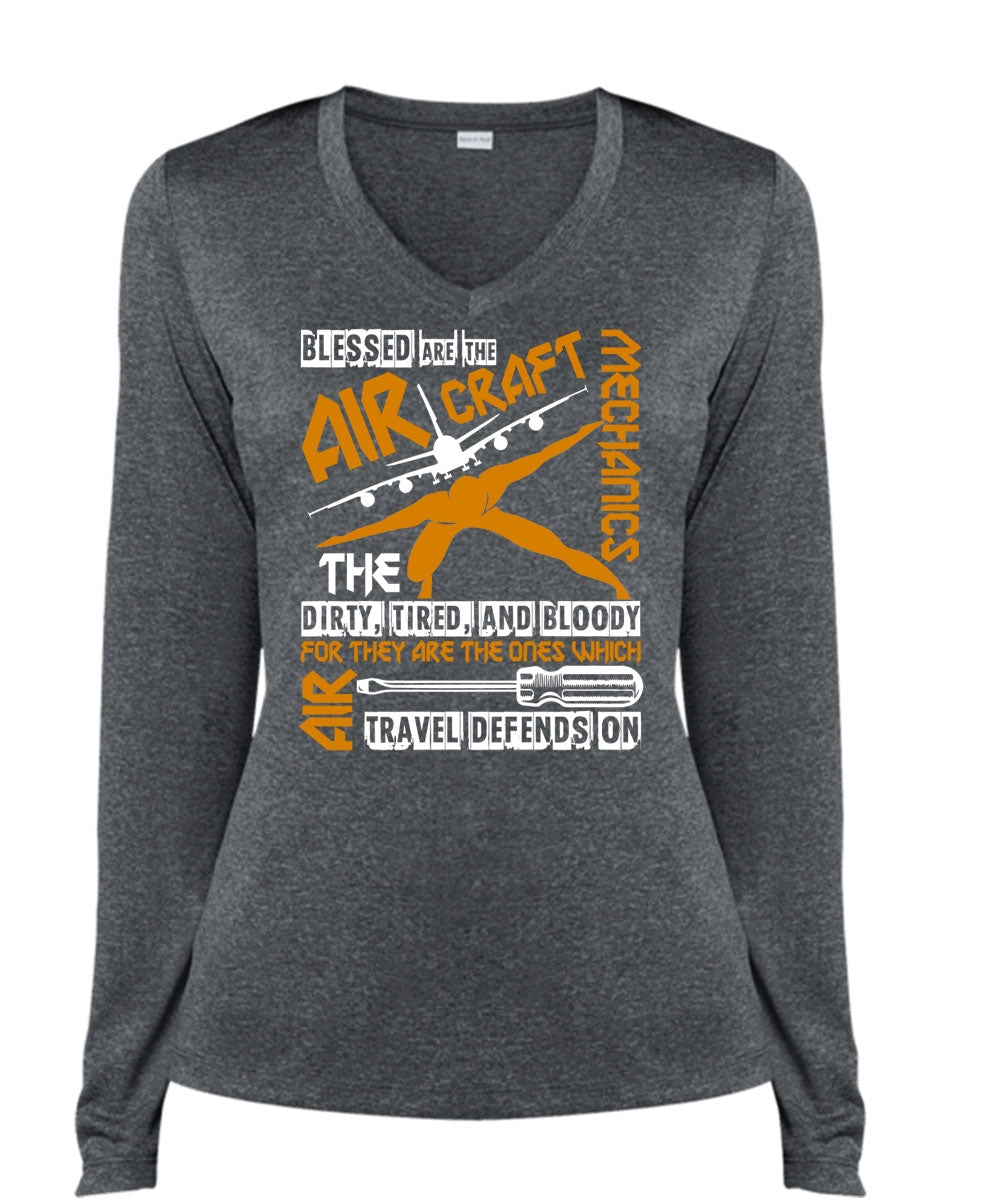 Blessed Are The Aircraft Mechanics T Shirt, Dirty Tired And Bloody T Shirt, Cool Shirt (Ladies LS Heather V-Neck)