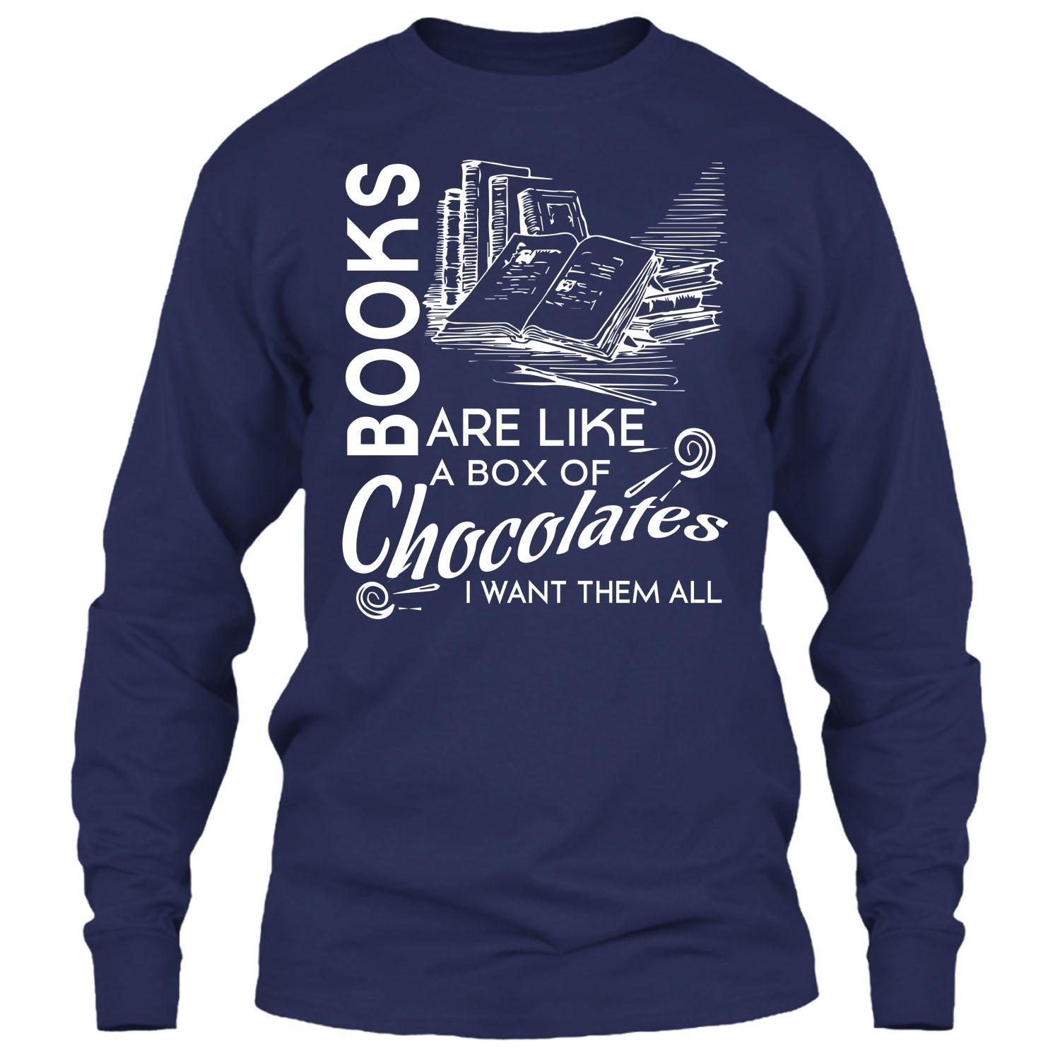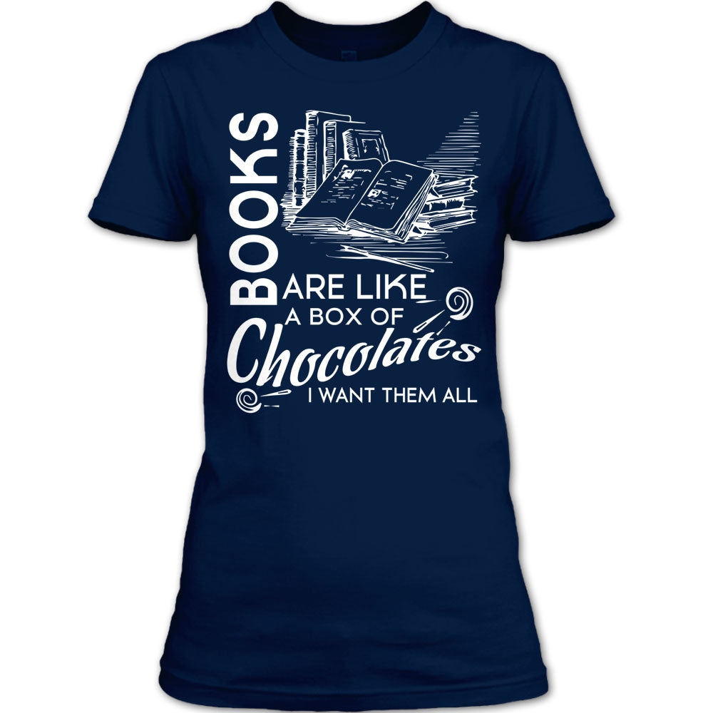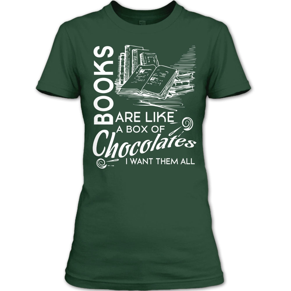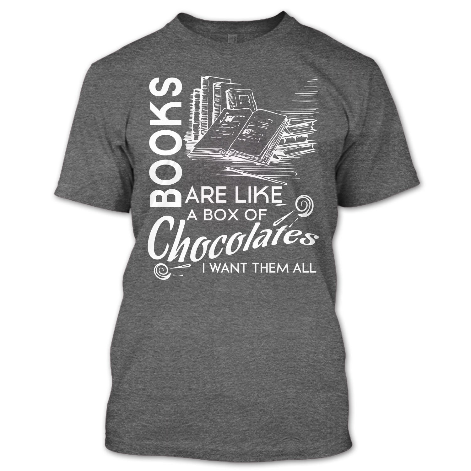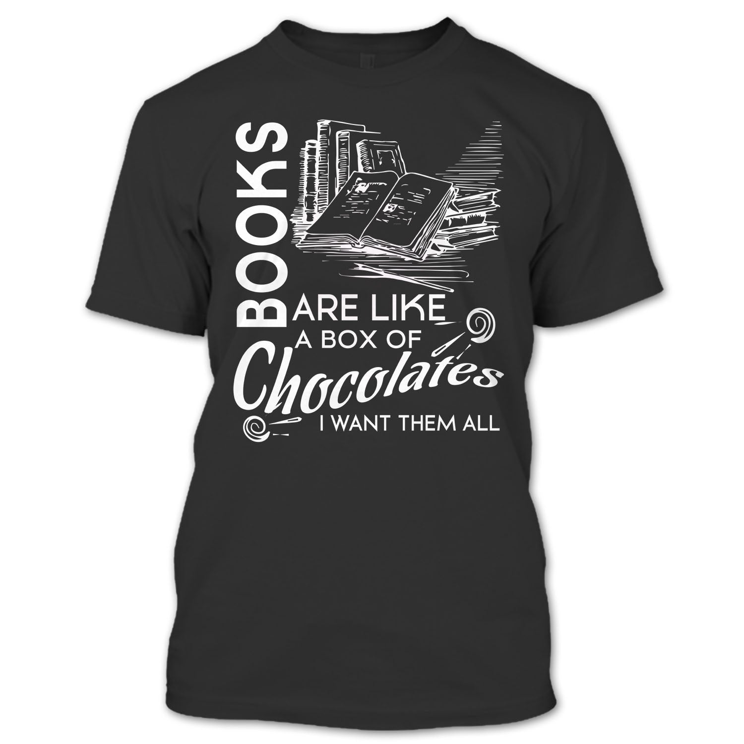 Books Are Like A Box Of Chocolate T Shirt, I Want Them All T Shirt