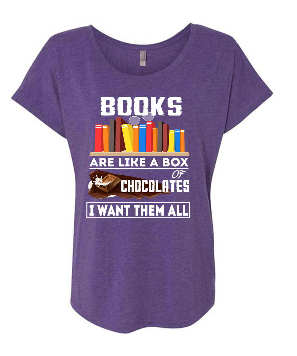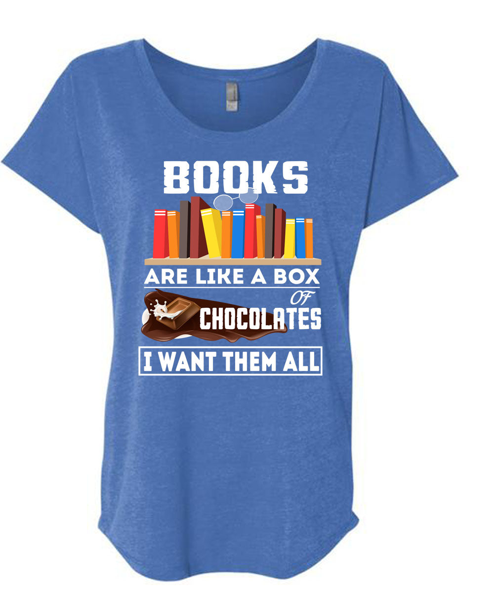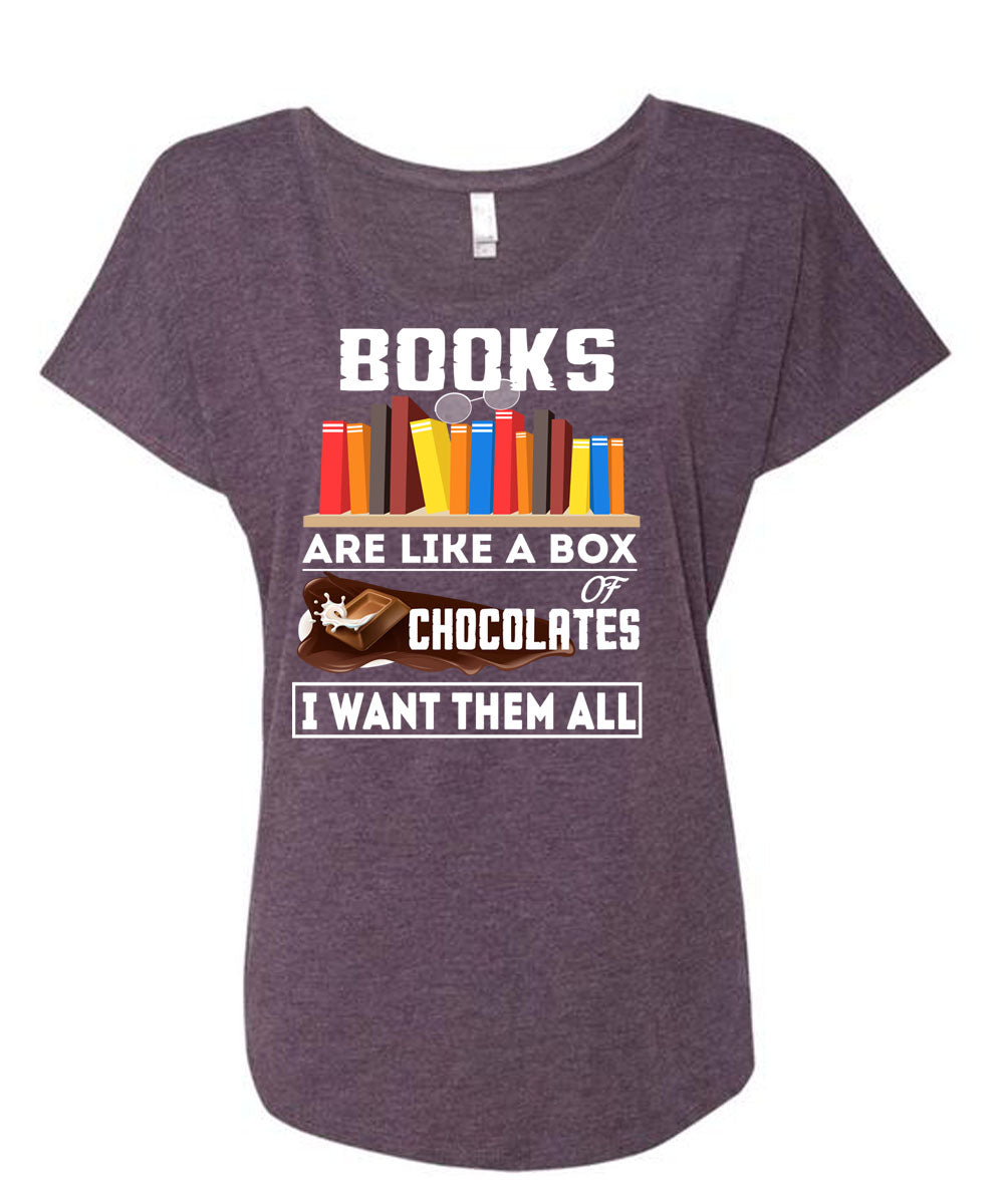 Books Are Like A Box Of Chocolates T Shirt, Being A Reader T Shirt, Cool Shirt (Ladies' Triblend Dolman Sleeve)