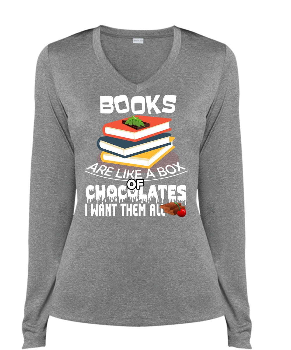 Books Are Like A Box Of Chocolates T Shirt, I Love Reading T Shirt, Cool Shirt (Ladies LS Heather V-Neck)