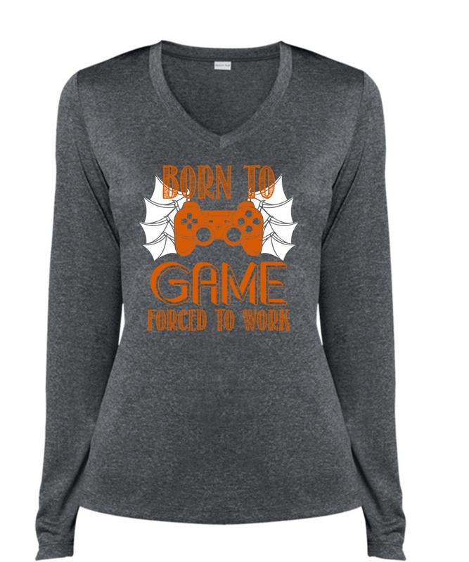 Born To Game Forced To Work T Shirt, Being A Gamer T Shirt, Cool Shirt (Ladies LS Heather V-Neck)