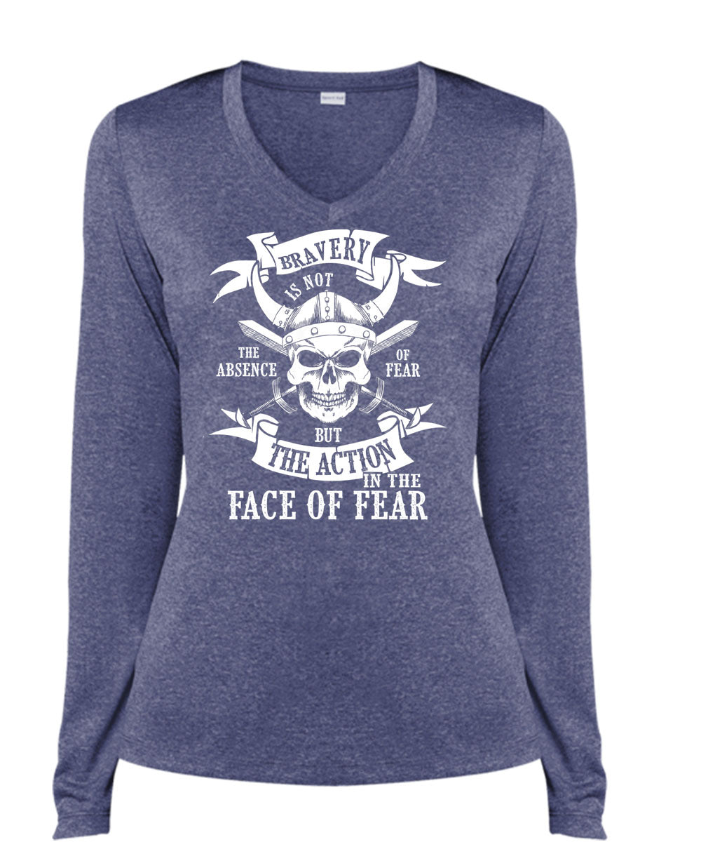 Bravery Is Not The Absence Of Fear T Shirt, The Action In The Face Of Fear T Shirt, Cool Shirt (Ladies LS Heather V-Neck)