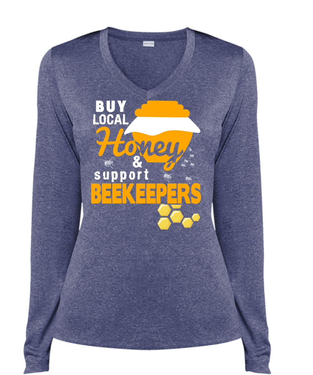 Buy Local Honey T Shirt, Support Beekeepers T Shirt, Cool Shirt (Ladies LS Heather V-Neck)
