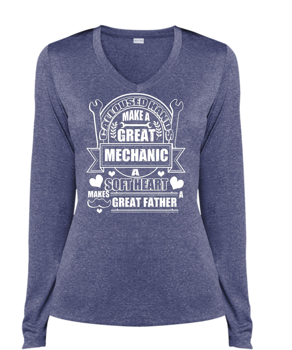 Calloused Hands Make A Great T Shirt, Mechanic A Soft Heart Makes A Great Father T Shirt, Cool Shirt (Ladies LS Heather V-Neck)
