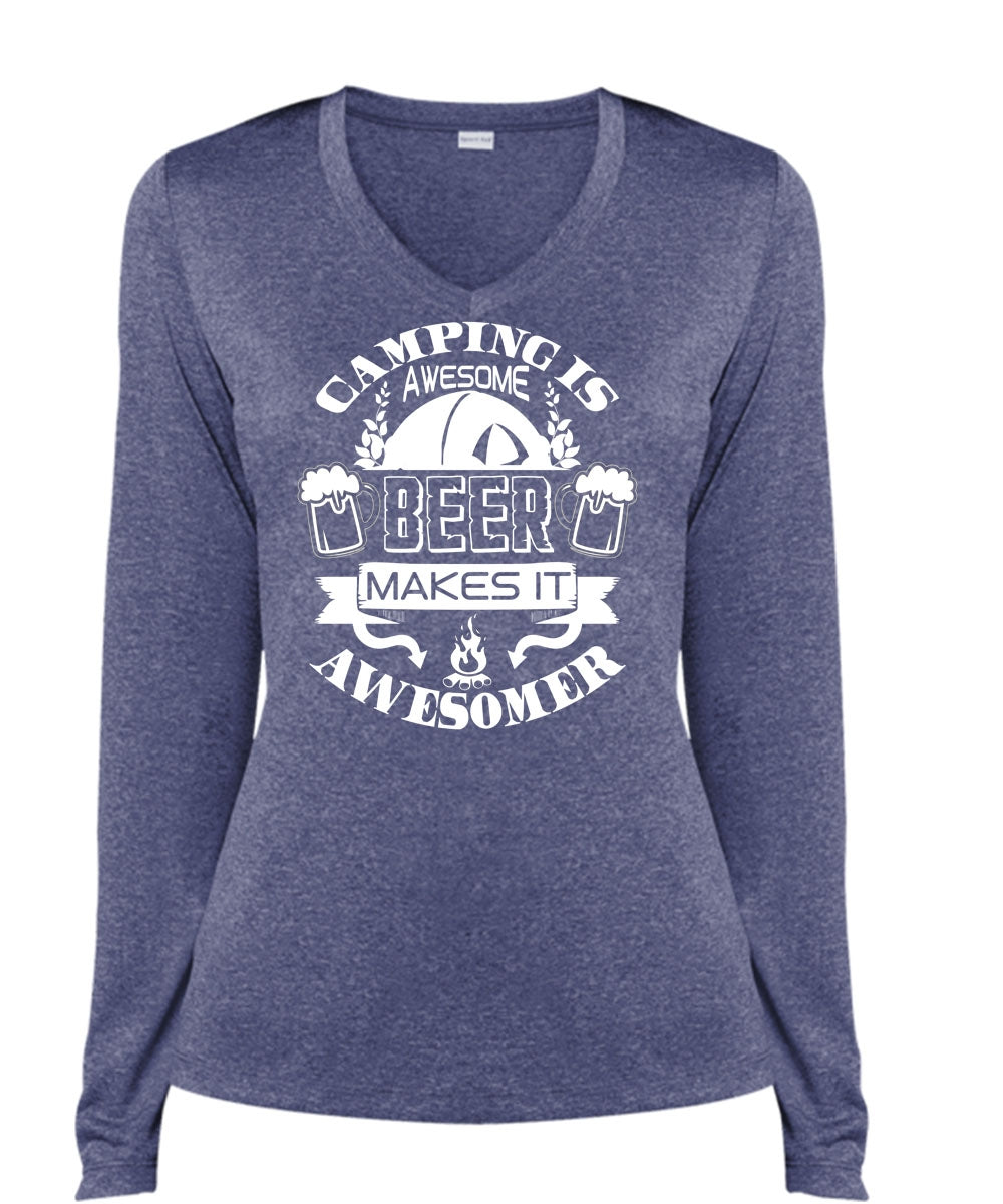 Camping Awesome Beer T Shirt, Being A Camper T Shirt, Cool Shirt (Ladies LS Heather V-Neck)
