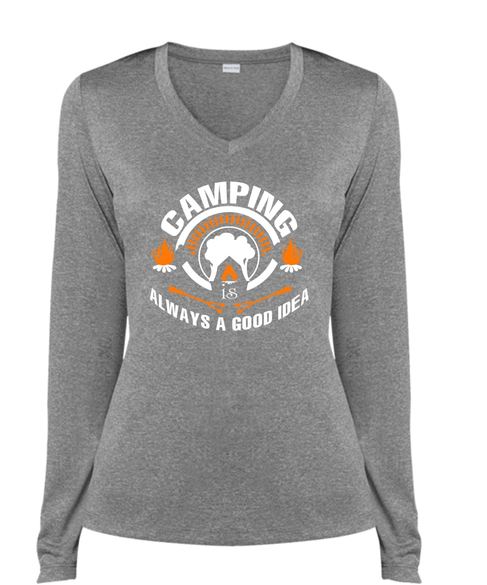 Camping Is Always A Good Idea T Shirt, Travel T Shirt (Ladies LS Heather V-Neck)