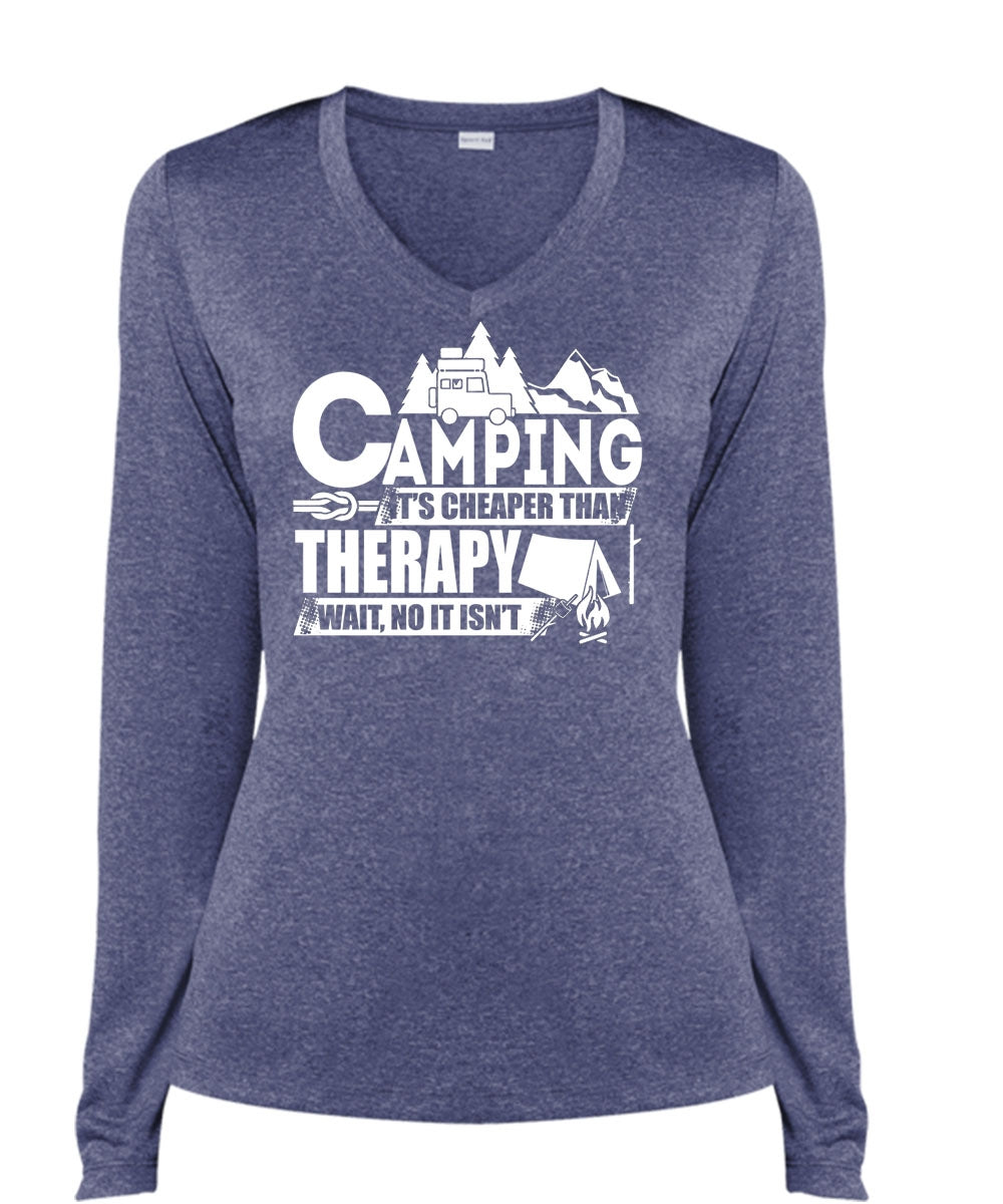 Camping It's Cheaper Than Therapy T Shirt, I Love Camping T Shirt, Cool Shirt (Ladies LS Heather V-Neck)
