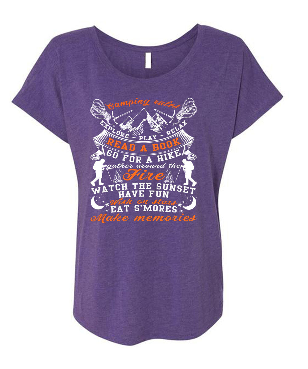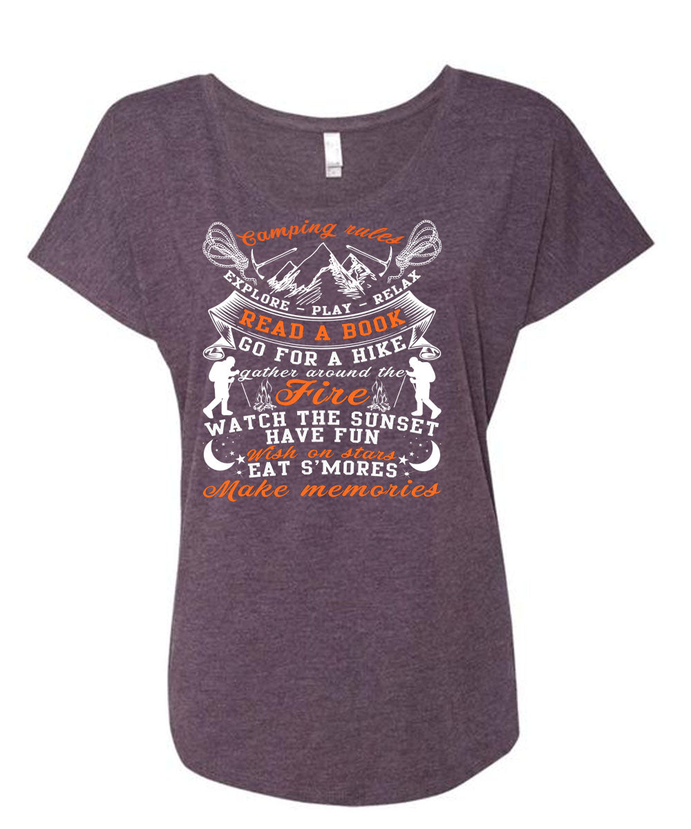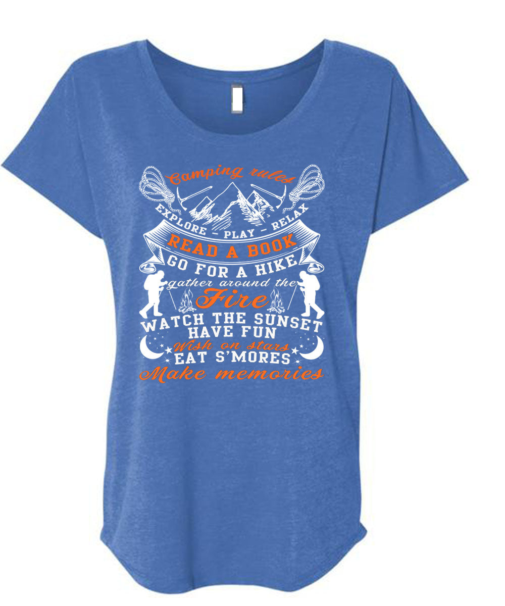 Camping Rules Explore Play Relax T Shirt, Read A Book T Shirt, Cool Shirt (Ladies' Triblend Dolman Sleeve)