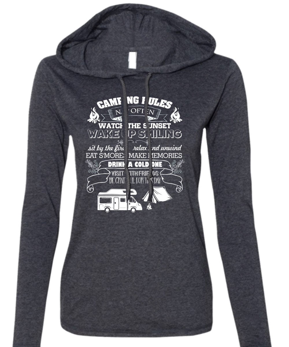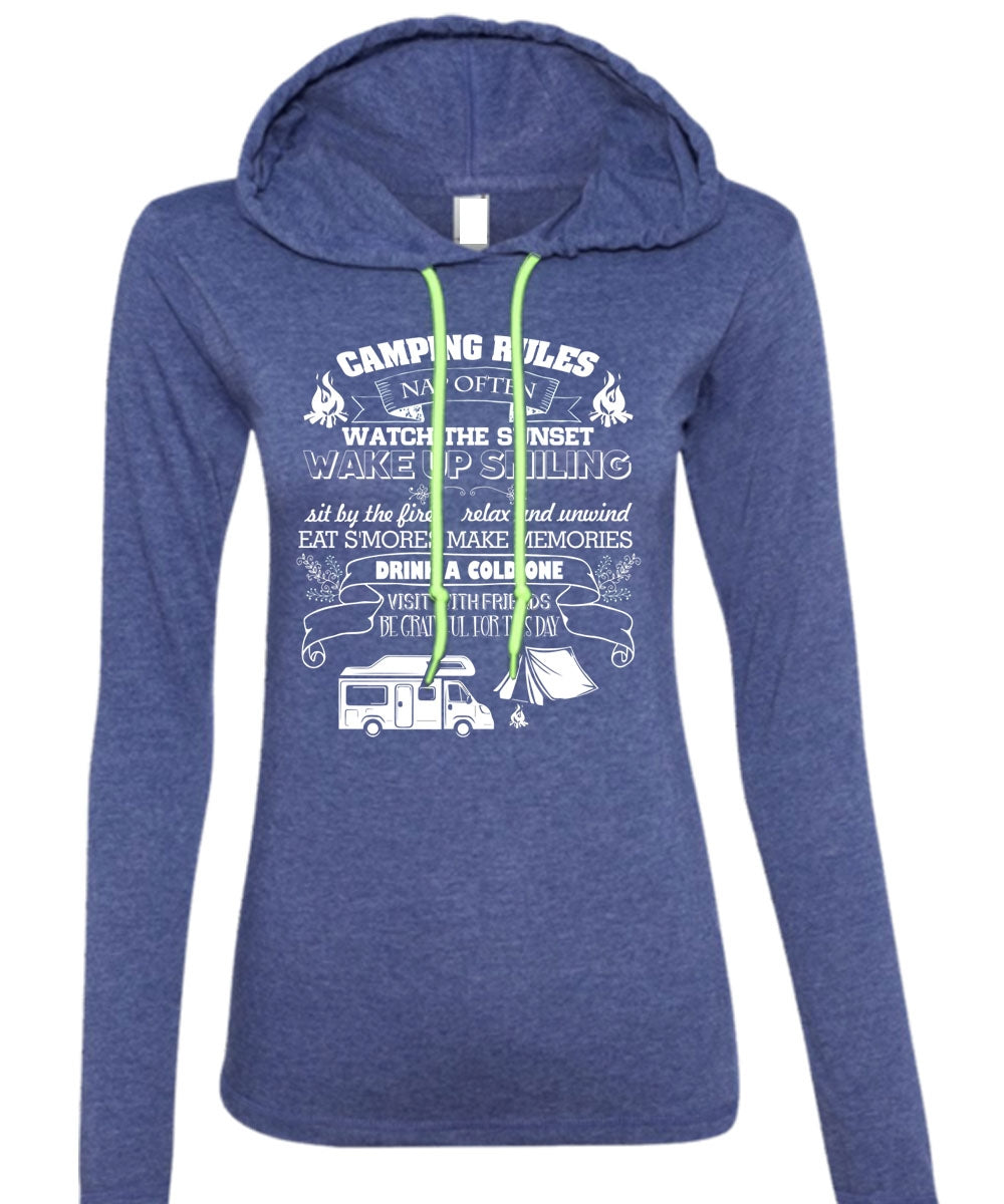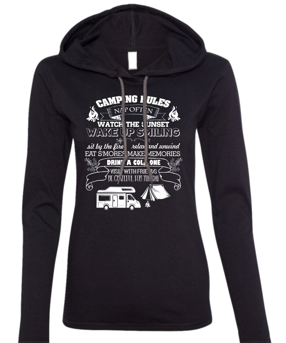 Camping Rules Nap Often T Shirt, Drink A Cold One T Shirt (Anvil Ladies Ringspun Hooded)