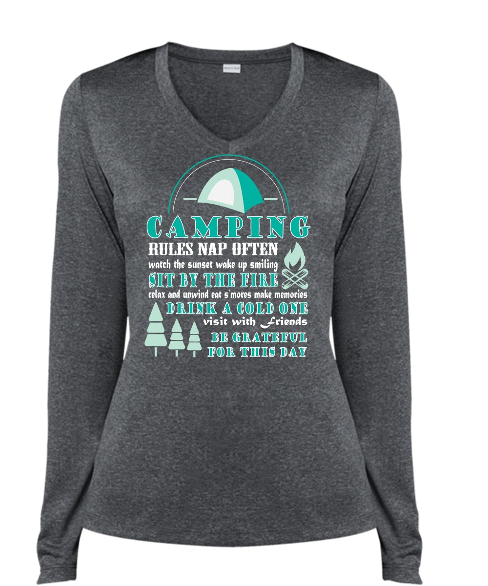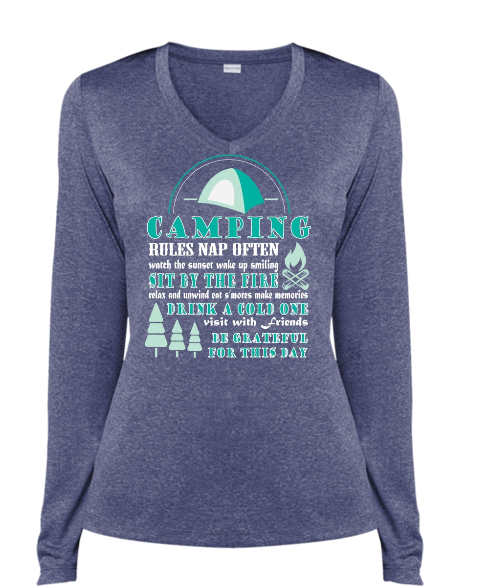 Camping Rules Nap Often T Shirt, Sit Buy The Fire T Shirt (Ladies LS Heather V-Neck)
