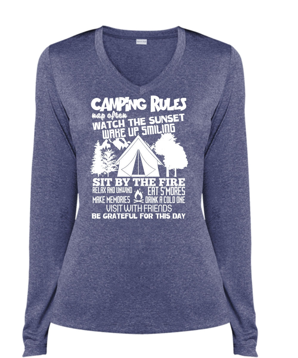Camping Rules Nap Often T Shirt, Sit By The Fire T Shirt, Cool Shirt (Ladies LS Heather V-Neck)