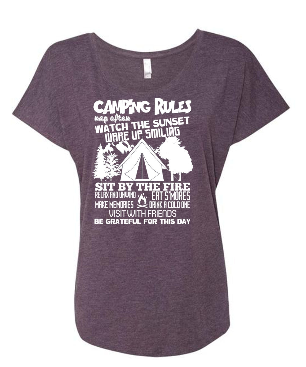 Camping Rules Nap Often T Shirt, Sit By The Fire T Shirt, Cool Shirt (Ladies' Triblend Dolman Sleeve)